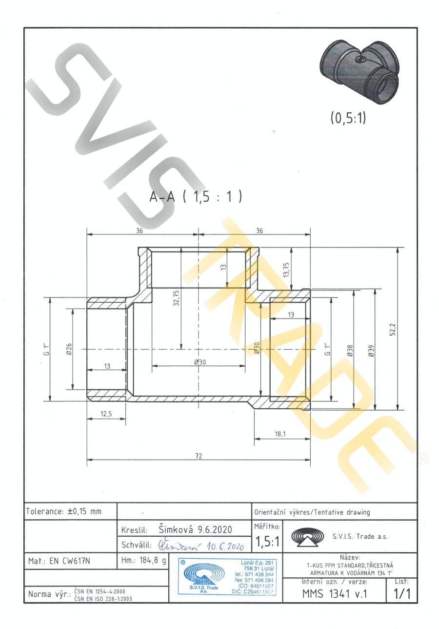 Navojni mesingani fiting, tip – T-komad sa cijevnim navojima unutarnji-unutarnji-unutarnji, bez površinske obrade. Spojni navoj G paralelan je spajanju, ne brtvljenju, na navoje sukladno ISO 288-1. Proizvedeno prema normi EN 1254-4.