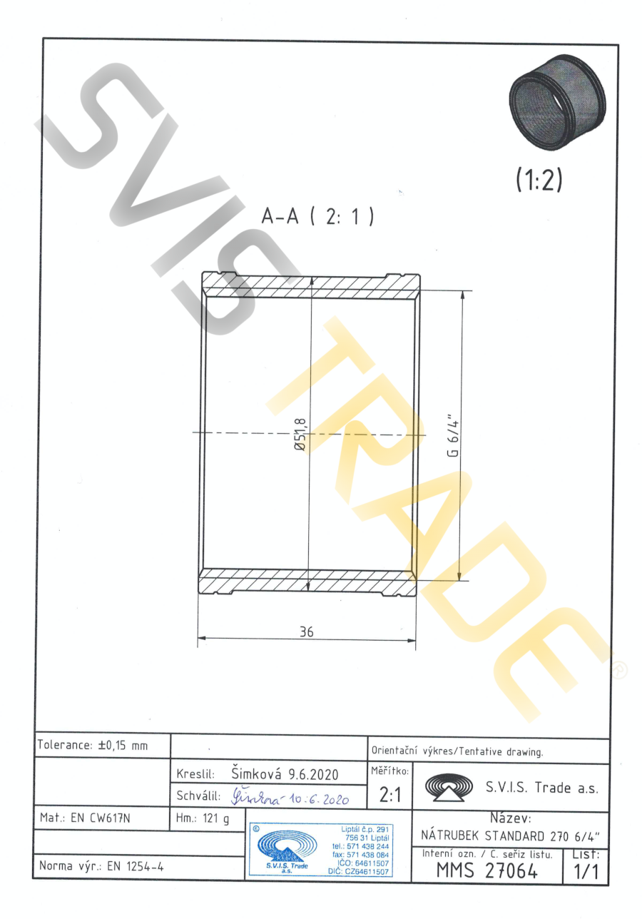 Navojni mesingani fiting, tip – Kolčak sa cijevnim navojima unutarnji-unutarnji, bez površinske obrade. Spojni navoj G paralelan je spajanju, ne brtvljenju, na navoje sukladno ISO 288-1. Proizvedeno prema normi EN 1254-4.