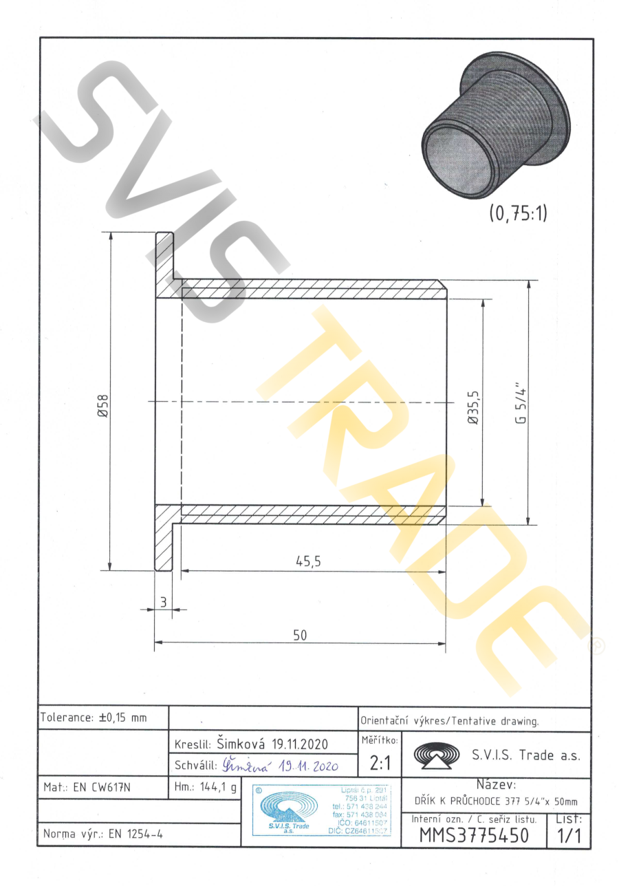 Mosazná průchodka k nádrži - díl dřík M – 377 MMS - STANDARD. Vyrobeno dle EN 1254-4 závitová mosazná tvarovka – průchodka k nádrži - díl dřík s trubkovými válcovým závitem G vnější dle ISO 228-1. Bez povrchové úpravy.
