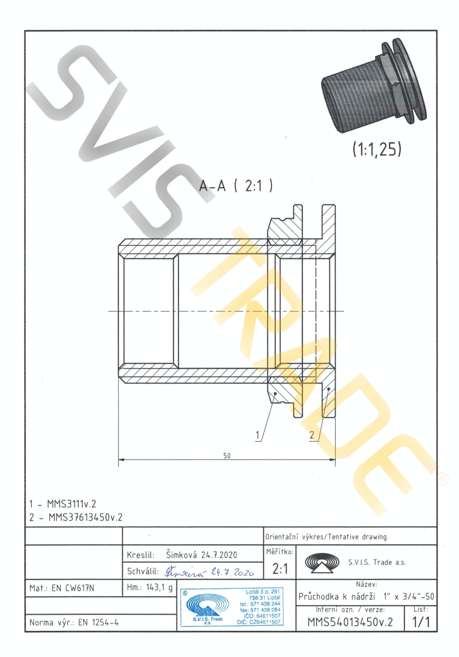 Mosazná průchodka k nádrži MF – 540 MMS - STANDARD. Vyrobeno dle EN 1254-4 závitová mosazná tvarovka – mosazná průchodka k nádrži s trubkovými válcovými závity G vnější x vnitřní dle ISO 228-1. Bez povrchové úpravy.