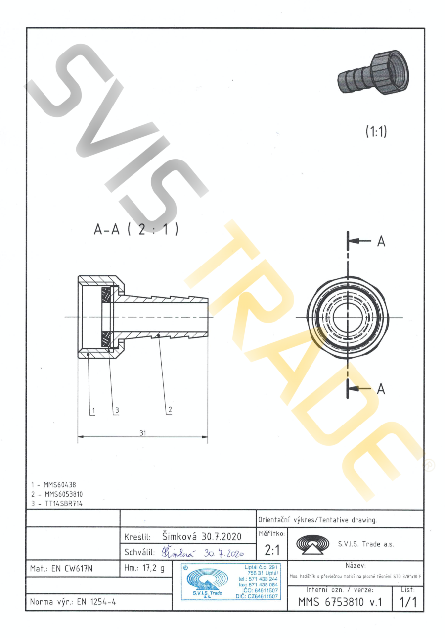 Mesingani adapter za crijevo s maticom F - 675 MMS - STANDARD. Izrađen prema EN 1254-4  s navojem - mesingani adapter za crijevo s navojem (adapter crijeva) s cjevastim cilindričnim navojem G unutarnje prema ISO 228-1. Bez površinske obrade.