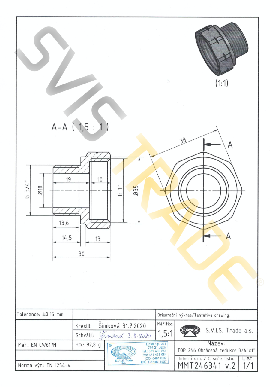 Navojni mesingani fiting, tip – Nipl reducirani sa cijevnim navojima vanjski-vanjski, bez površinske obrade. Spojni navoj G paralelan je spajanju, ne brtvljenju, na navoje sukladno ISO 288-1. Proizvedeno prema normi EN 1254-4.