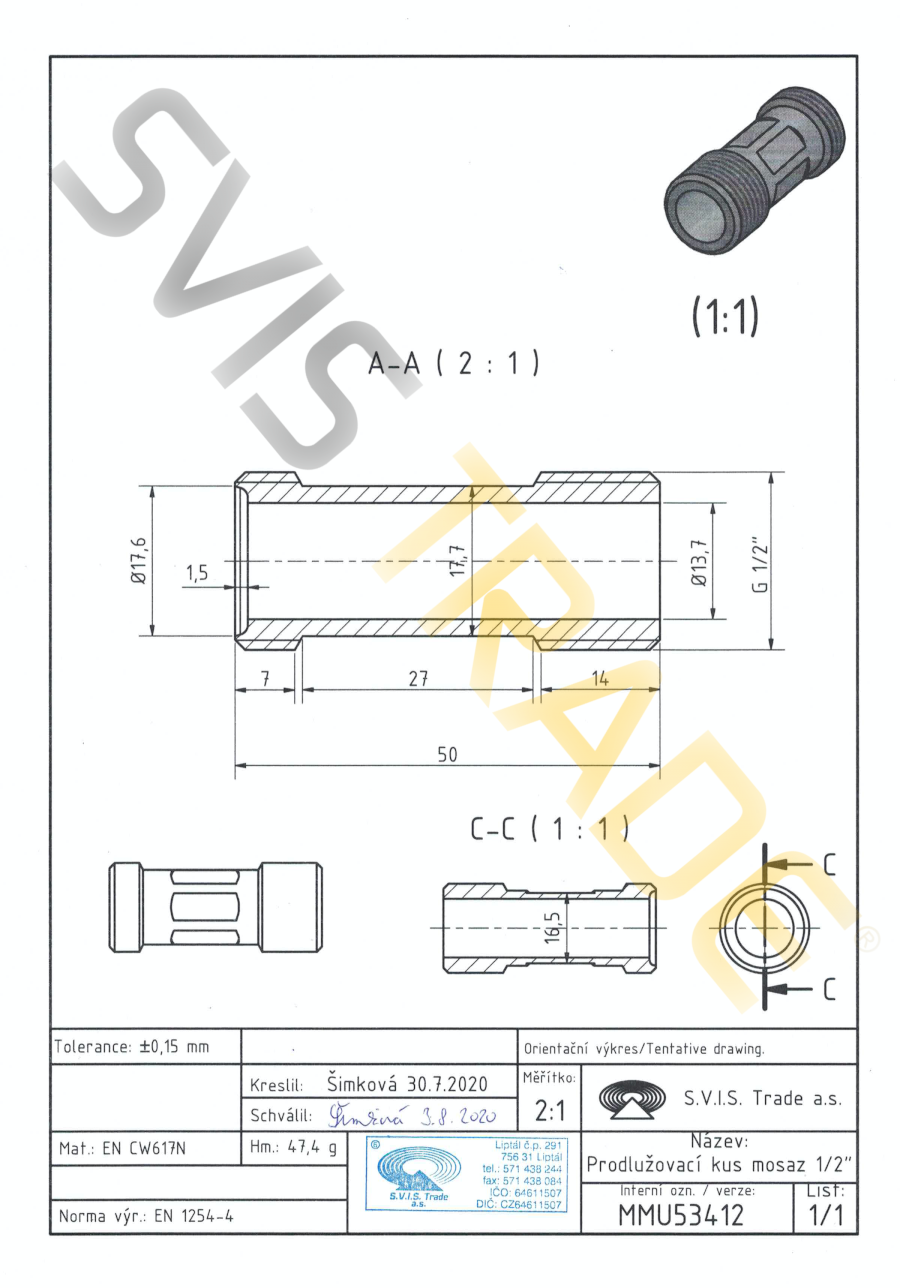 Produljenje - dio teleskopkog holendera - 534 MMU - UNIVERSAL. Izrađena prema EN 1254-4 Vijčani navoj - Mesing s cjevastim cilindričnim navojem G vanjski prema ISO 228-1. Bez površinske obrade.