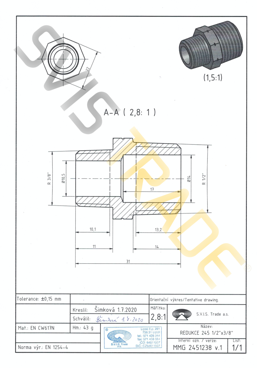 Sárgaréz csatlakozó, szűkített MM – 245 MMG - GÁZ. Az EN 1254-4 szabvány szerint készült tömör sárgaréz csatlakozó – szűkített sárgaréz csatlakozó csőszerű kúpos menettel R külső x R külső. Felületkezelés nélkül.