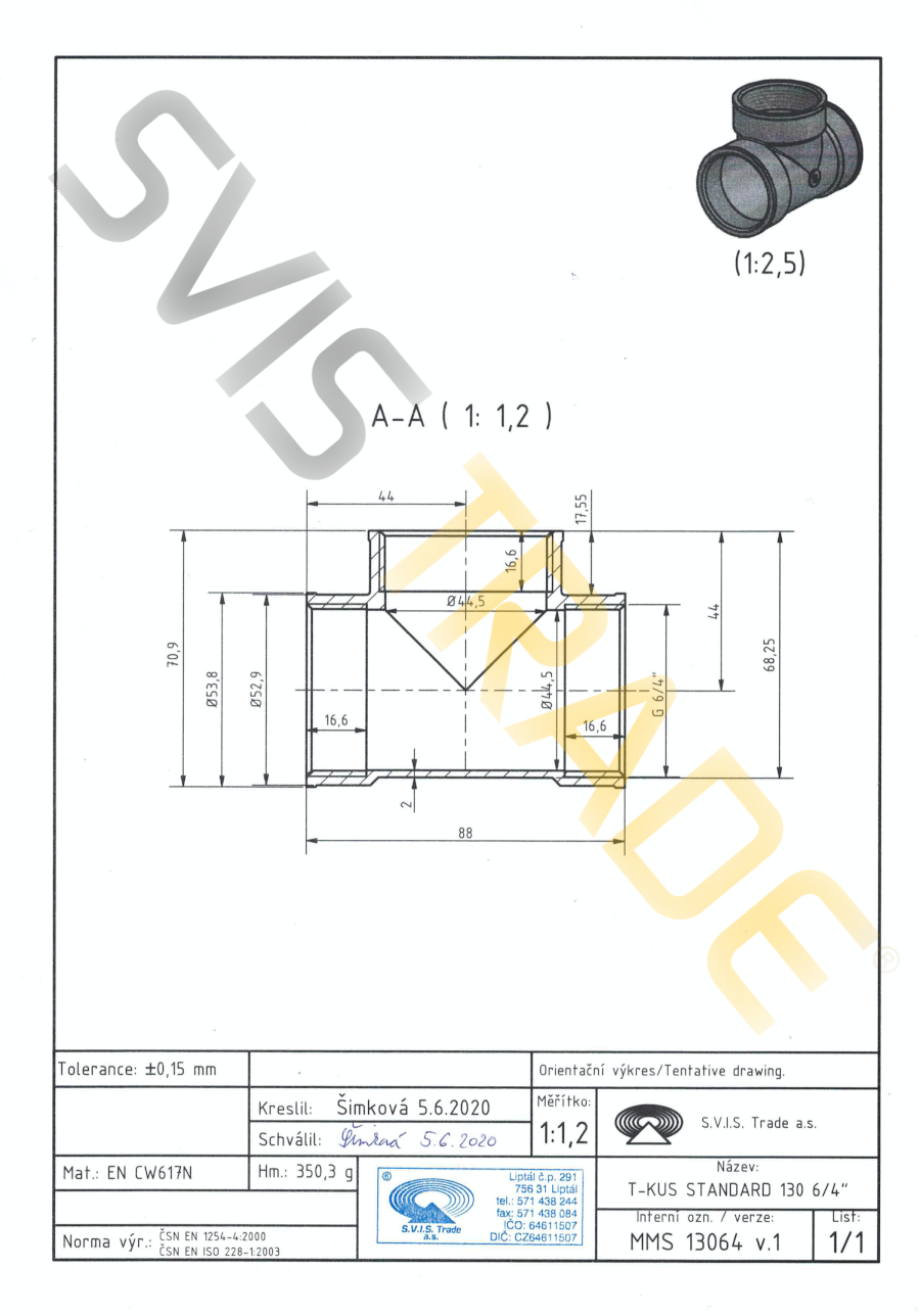 Menetes sárgaréz idom, T-idom belső-belső-belső csőmenettel, felületi kezelés nélkül. Hengeres G menettel, ahol a tömítés nem a menetben van - ISO 228-1 norma szerint. Gyártása az EN 1254-4 szerint történik. S.V.I.S. Trade Kft. - menetes idomok Csehországi gyártója , az ISO 9001, ISO 14001, OHSAS 18001 tanúsítványok tulajdonosa. A sárgaréz idomok meghibásodása okozta károkra, biztosítás van érvényben az egész EU területén. A fittingek felhasználhatóak levegő, víz, ivóvíz , nem abrazív és nem agresszív anyagokat tartalmazó rendszerekhez, 1,6MP nyomás értékig és -20°C tól 120°C feltételek mellett , miközben biztosított az anyagok fagyállósága. A STANDARD minőségben előállitott fittingek magasabb követelményeknek felelnek meg a menetek szempontjából. A sárgaréz idomok a CW617N minőségi réz anyagból vannak előállitva. A gyártó a fittingek tömítéséhez tefloncsík illetve teflon tömítőzsinór használatát javasolja. A gyártó NEM AJÁNLJA a kenderből készült tömítések használatát sárgaréz fittingjeihez. A gyártó ajánlata felhasználáshoz, szereléshez: víz és ivóvíz rendszerekhez, központi fűtéshez, levegő fűtéses rendszerekhez.