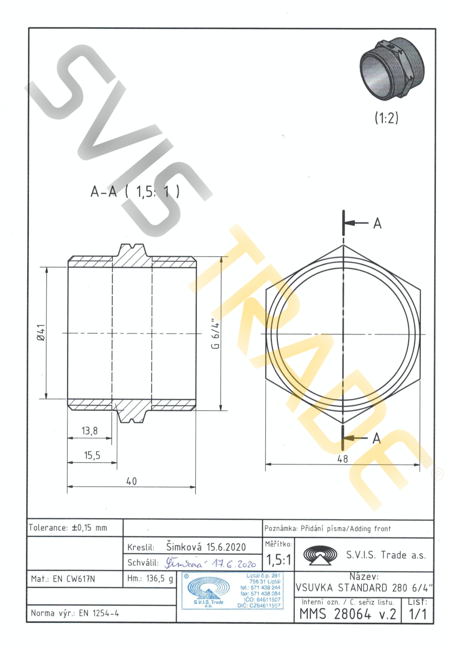 Menetes sárgaréz idom, közcsavar külső-külső csőmenettel, felületi kezelés nélkül. Hengeres G menettel, ahol a tömítés nem a menetben van - ISO 228-1 norma szerint. Gyártása az EN 1254-4 szerint történik. S.V.I.S. Trade Kft. - menetes idomok Csehországi gyártója , az ISO 9001, ISO 14001, OHSAS 18001 tanúsítványok tulajdonosa. A sárgaréz idomok meghibásodása okozta károkra, biztosítás van érvényben az egész EU területén. A fittingek felhasználhatóak levegő, víz, ivóvíz , nem abrazív és nem agresszív anyagokat tartalmazó rendszerekhez, 1,6MP nyomás értékig és -20°C tól 120°C feltételek mellett , miközben biztosított az anyagok fagyállósága. A STANDARD minőségben előállitott fittingek magasabb követelményeknek felelnek meg a menetek szempontjából. A sárgaréz idomok a CW617N minőségi réz anyagból vannak előállitva. A gyártó a fittingek tömítéséhez tefloncsík illetve teflon tömítőzsinór használatát javasolja. A gyártó NEM AJÁNLJA a kenderből készült tömítések használatát sárgaréz fittingjeihez. A gyártó ajánlata felhasználáshoz, szereléshez: víz és ivóvíz rendszerekhez, központi fűtéshez, levegő fűtéses rendszerekhez.