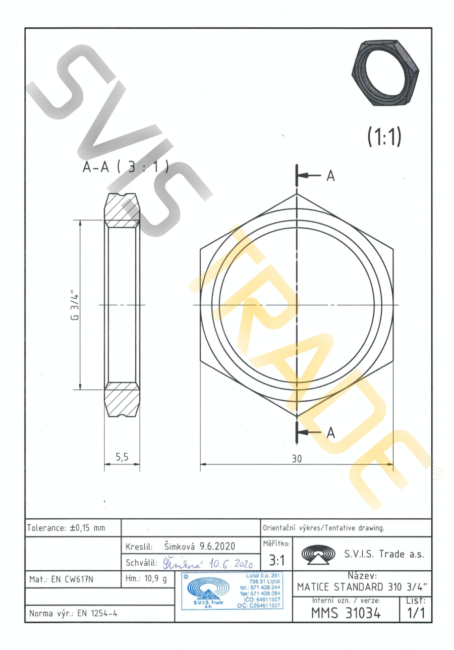 Menetes sárgaréz idom, anyacsavar, belső csőmenettel, belső csőmenettel, felületi kezelés nélkül. Hengeres G menettel, ahol a tömítés nem a menetben van - ISO 228-1 norma szerint. Gyártása az EN 1254-4 szerint történik. S.V.I.S. Trade Kft. - menetes idomok Csehországi gyártója , az ISO 9001, ISO 14001, OHSAS 18001 tanúsítványok tulajdonosa. A sárgaréz idomok meghibásodása okozta károkra, biztosítás van érvényben az egész EU területén. A fittingek felhasználhatóak levegő, víz, ivóvíz , nem abrazív és nem agresszív anyagokat tartalmazó rendszerekhez, 1,6MP nyomás értékig és -20°C tól 120°C feltételek mellett , miközben biztosított az anyagok fagyállósága. A STANDARD minőségben előállitott fittingek magasabb követelményeknek felelnek meg a menetek szempontjából. A sárgaréz idomok a CW617N minőségi réz anyagból vannak előállitva. A gyártó a fittingek tömítéséhez tefloncsík illetve teflon tömítőzsinór használatát javasolja. A gyártó NEM AJÁNLJA a kenderből készült tömítések használatát sárgaréz fittingjeihez. A gyártó ajánlata felhasználáshoz, szereléshez: víz és ivóvíz rendszerekhez, központi fűtéshez, levegő fűtéses rendszerekhez.