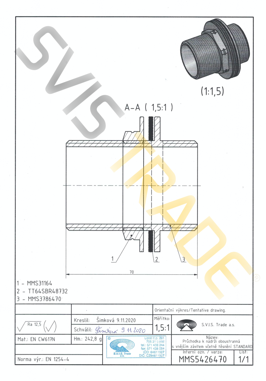 Réz átvezető cső a tartályhoz, kétoldalas, gumitömítéssel M – 542 MMS – STANDARD. Az EN 1254-4 szabvány szerint gyártott menetes réz idom – réz tartály átvezető oporszárral és külső hengeres csőmenetekkel G szerint ISO 228-1. Az átvezető lehetővé teszi a tartály falán történő átmenetet, csatlakoztatható csaphoz, ürítő / töltő szelepekhez vagy szivattyú szívó oldalához stb. Felületkezelés nélkül.