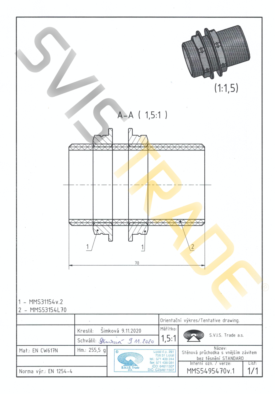 Mosazná stěnová průchodka M – 549 MMS - STANDARD. Vyrobeno dle EN 1254-4 závitová mosazná tvarovka – mosazná průchodka přes stěnu s vnějším trubkovým válcovým závitem G dle ISO 228-1a dvěmi volnými maticemi. Bez povrchové úpravy.