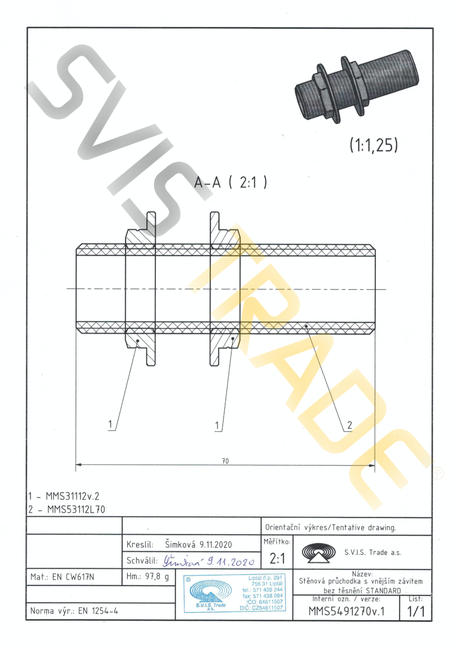 Réz fali átvezető M – 549 MMS – STANDARD Készült az EN 1254-4 szabvány szerint, menetes réz idom – réz átvezető falon, külső hengeres csőmenettel G az ISO 228-1 szerint, két különálló anyával. Felületkezelés nélkül.