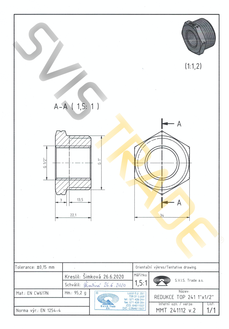 Menetes sárgarézidom, szűkítő belső – külső szűkített csőmenettel, felületi kezelés nélkül. Hengeres G menettel nem tőmítő mentetekhez az ISO 228-1 norma szerint. Gyártása az EN 1254-4 norma szerint történik. Használata: Víz(ivóvíz), levegő és nem agresszív médiumok vezetékekben való szállítására, maximális 1,6 MPa nyomásig és 0C tól +120C fokig alkalmas(víz fagyásmentes elegyek nélkül).