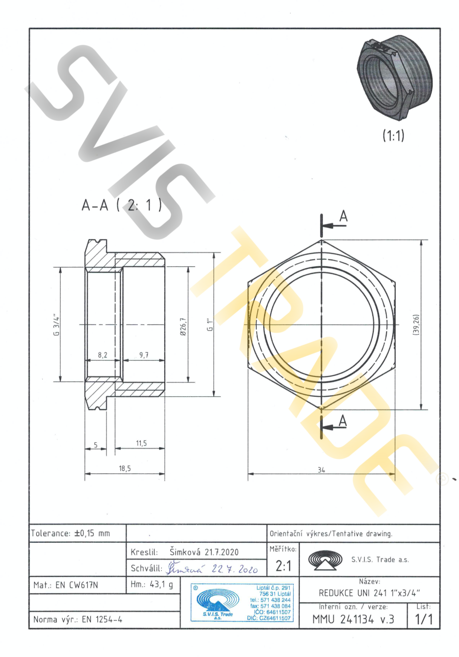 Menetes sárgarézidom, szűkítő belső – külső szűkített csőmenettel, felületi kezelés nélkül. Hengeres G menettel nem tőmítő mentetekhez az ISO 228-1 norma szerint. Gyártása az EN 1254-4 norma szerint történik. Használata: Víz(ivóvíz), levegő és nem agresszív médiumok vezetékekben való szállítására, maximális 1,6 MPa nyomásig és 0C tól +120C fokig alkalmas(víz fagyásmentes elegyek nélkül).