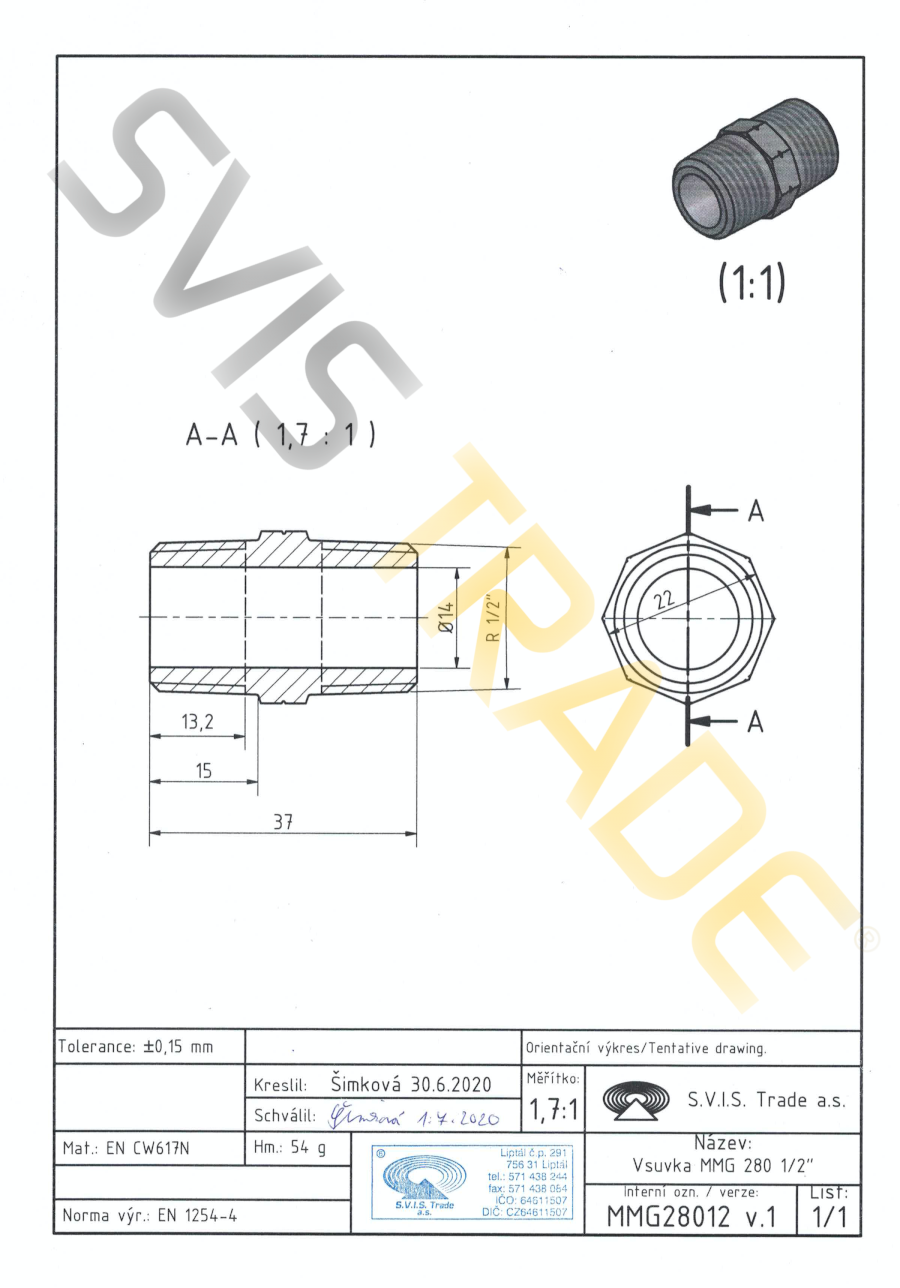 Gwintowana kształtka z mosiądzu, rodzaj – nypel z rurowymi gwintami zewnątrz x zewnątrz, bez obróbki powierzchniowej. Gwinty łączące G są walcowe i szczelne w połączeniach według ISO 228-1. Wyprodukowana według normy EN 1254-4.