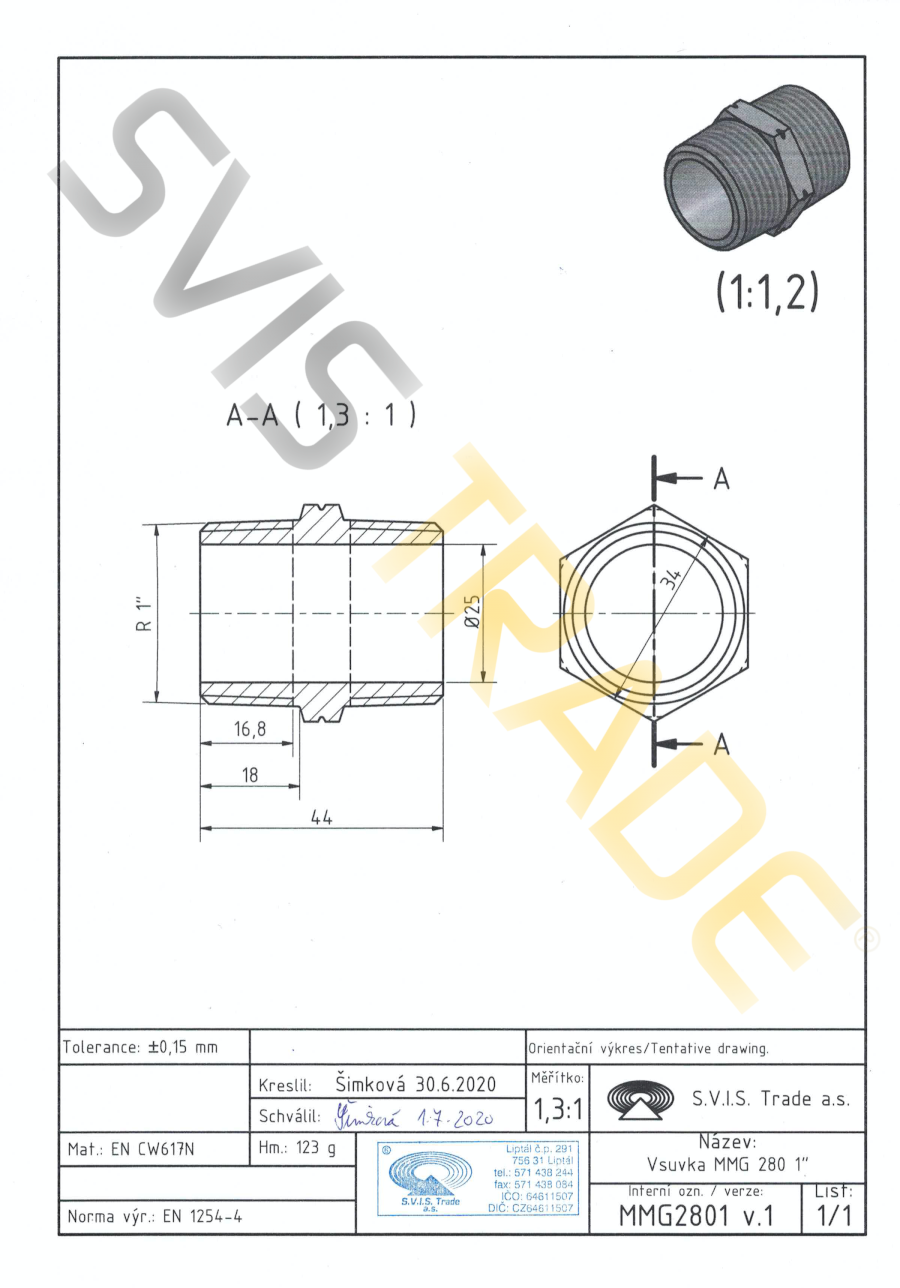 Gwintowana kształtka z mosiądzu, rodzaj – nypel z rurowymi gwintami zewnątrz x zewnątrz, bez obróbki powierzchniowej. Gwinty łączące G są walcowe i szczelne w połączeniach według ISO 228-1. Wyprodukowana według normy EN 1254-4.
