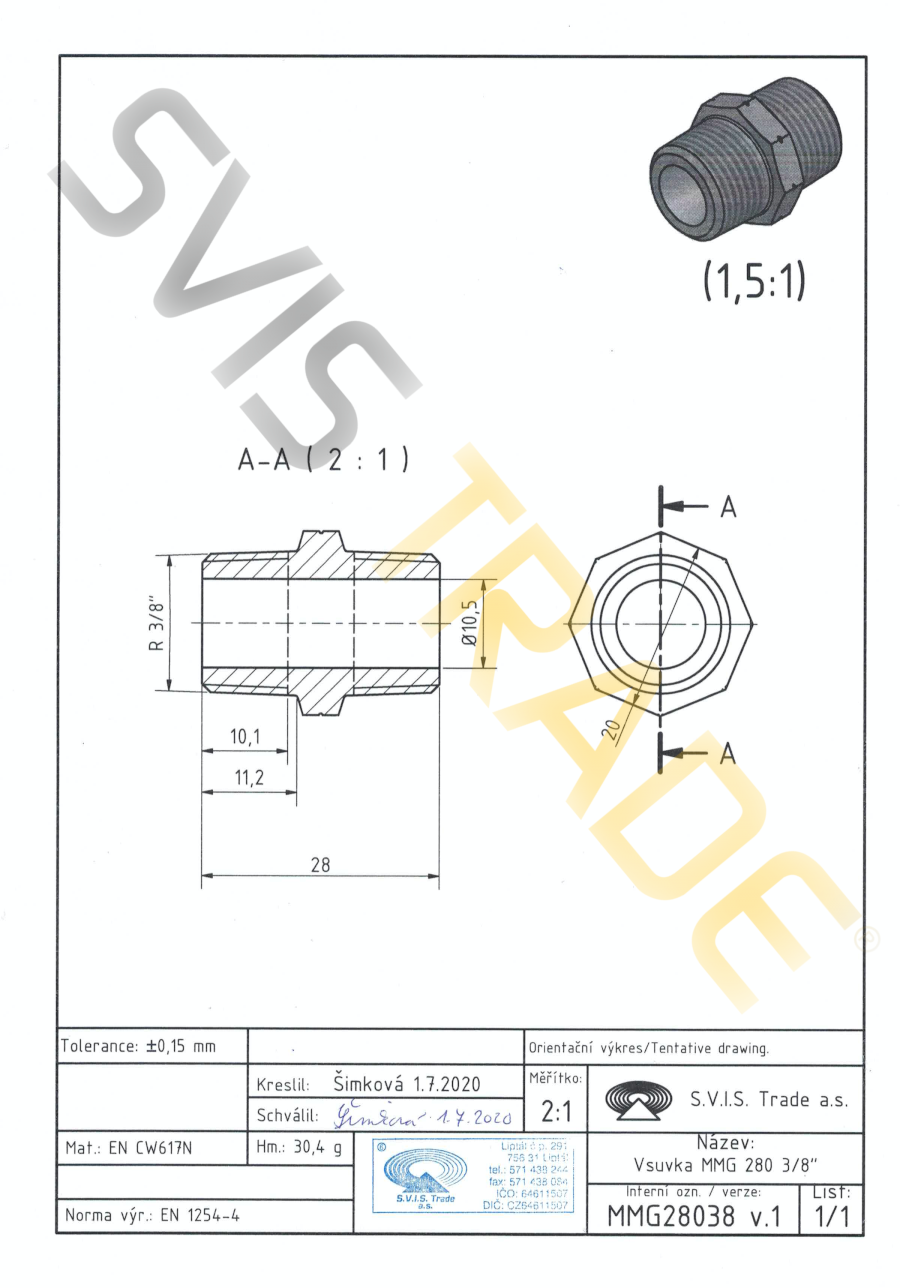 Gwintowana kształtka z mosiądzu, rodzaj – nypel z rurowymi gwintami zewnątrz x zewnątrz, bez obróbki powierzchniowej. Gwinty łączące G są walcowe i szczelne w połączeniach według ISO 228-1. Wyprodukowana według normy EN 1254-4.