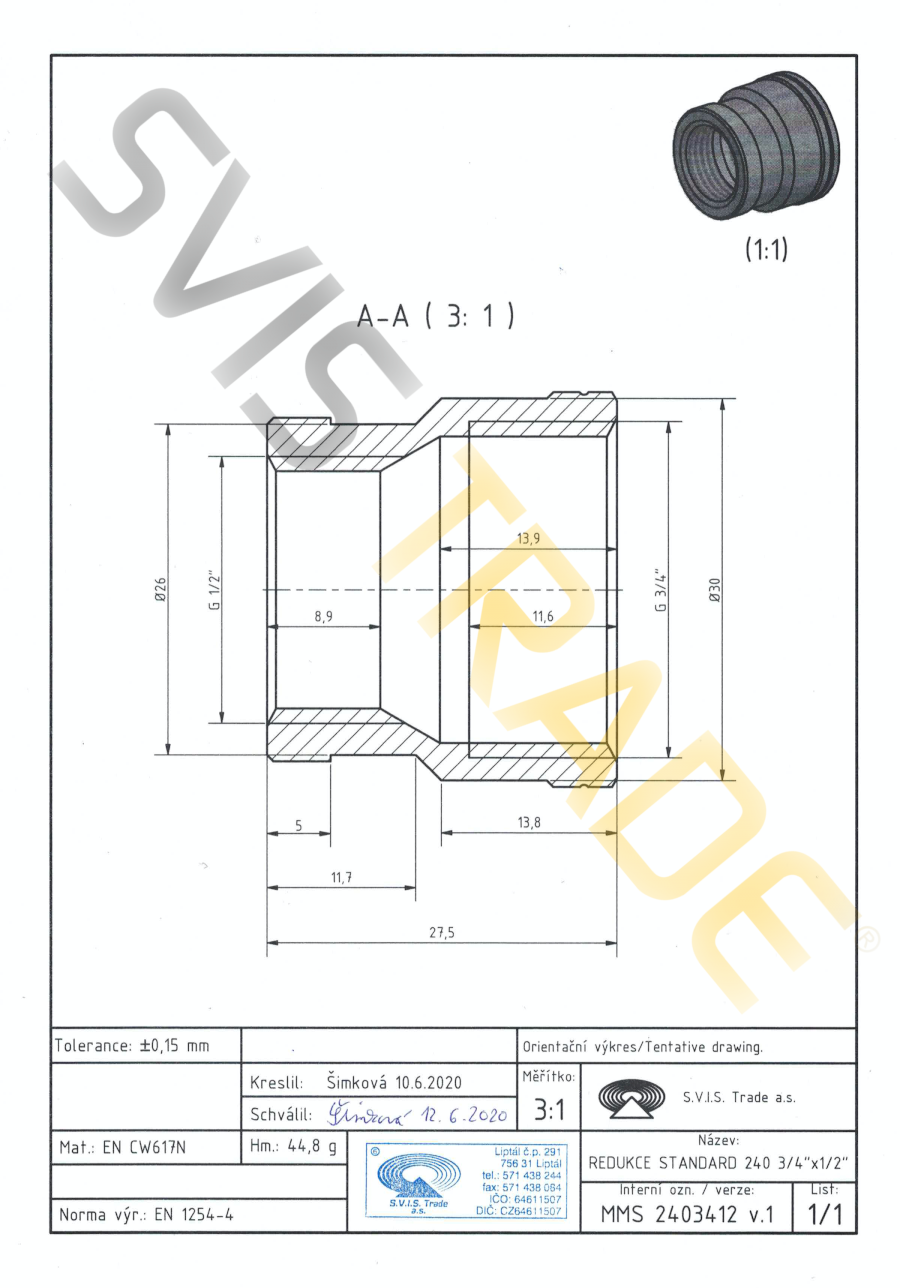 Mosiężna mufa z przejściem redukcyjnym FF - 240 MMS-STANDARD. Wyprodukowana według normy EN 1254-4 - gwintowana mosiężna złączka. Bez obróbki powierzchniowej. S.V.I.S Trade-czeski producent kształtek jest posiadaczem certyfikatów ISO 9001,ISO 14001,OHSAS 18001. Na mosiężne kształtki stosujemy ubezpieczenie szkody na całym terytorium EU. Zaprojektowane do dystrybucji wody,wody pitnej,powietrza,nieabrazyjne i nie agresywne media do dopuszczalnego ciśnienia 1,6 MPa i temperatury od -20°C do 120 °C, z koniecznością uniknięcia zamrożenia mediów. Seria kształtek STANDARD-spełnia wyższe wymagania dla połączeń gwintowanych. Mosiężne kształtki są produkowane z mosiądzu CW617 N. Jako materiał uszczelniający do montażu złączek mosiężnych zaleca się uzywanie taśmy teflonowej lub przewodu teflonowego. Producent NIE ZALECA używania konopi jako materiał uszczelniający. Zalecenia dla instalacji: dystrybucja wody,dystrybucja wody pitnej,dystrybucja ciepła,powietrza.