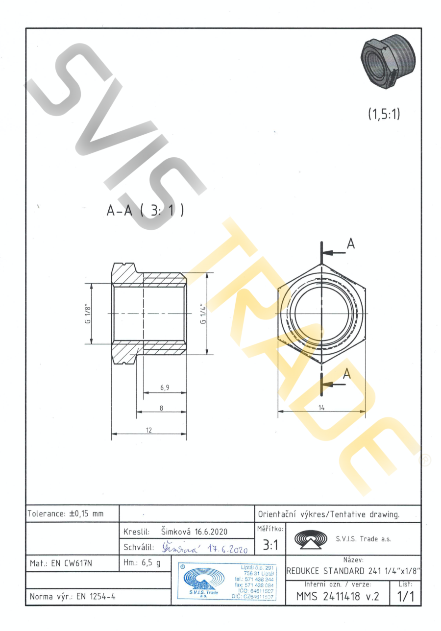 Mosiężna redukcja (przejście) MF - 241 MMS-STANDARD. Wyprodukowana według normy EN 1254-4 - gwintowana mosiężna złączka. Bez obróbki powierzchniowej. S.V.I.S Trade-czeski producent kształtek jest posiadaczem certyfikatów ISO 9001,ISO 14001,OHSAS 18001. Na mosiężne kształtki stosujemy ubezpieczenie szkody na całym terytorium EU. Zaprojektowane do dystrybucji wody,wody pitnej,powietrza,nieabrazyjne i nie agresywne media do dopuszczalnego ciśnienia 1,6 MPa i temperatury od -20°C do 120 °C, z koniecznością uniknięcia zamrożenia mediów. Seria kształtek STANDARD-spełnia wyższe wymagania dla połączeń gwintowanych. Mosiężne kształtki są produkowane z mosiądzu CW617 N. Jako materiał uszczelniający do montażu złączek mosiężnych zaleca się uzywanie taśmy teflonowej lub przewodu teflonowego. Producent NIE ZALECA używania konopi jako materiał uszczelniający. Zalecenia dla instalacji: dystrybucja wody,dystrybucja wody pitnej,dystrybucja ciepła,powietrza.
