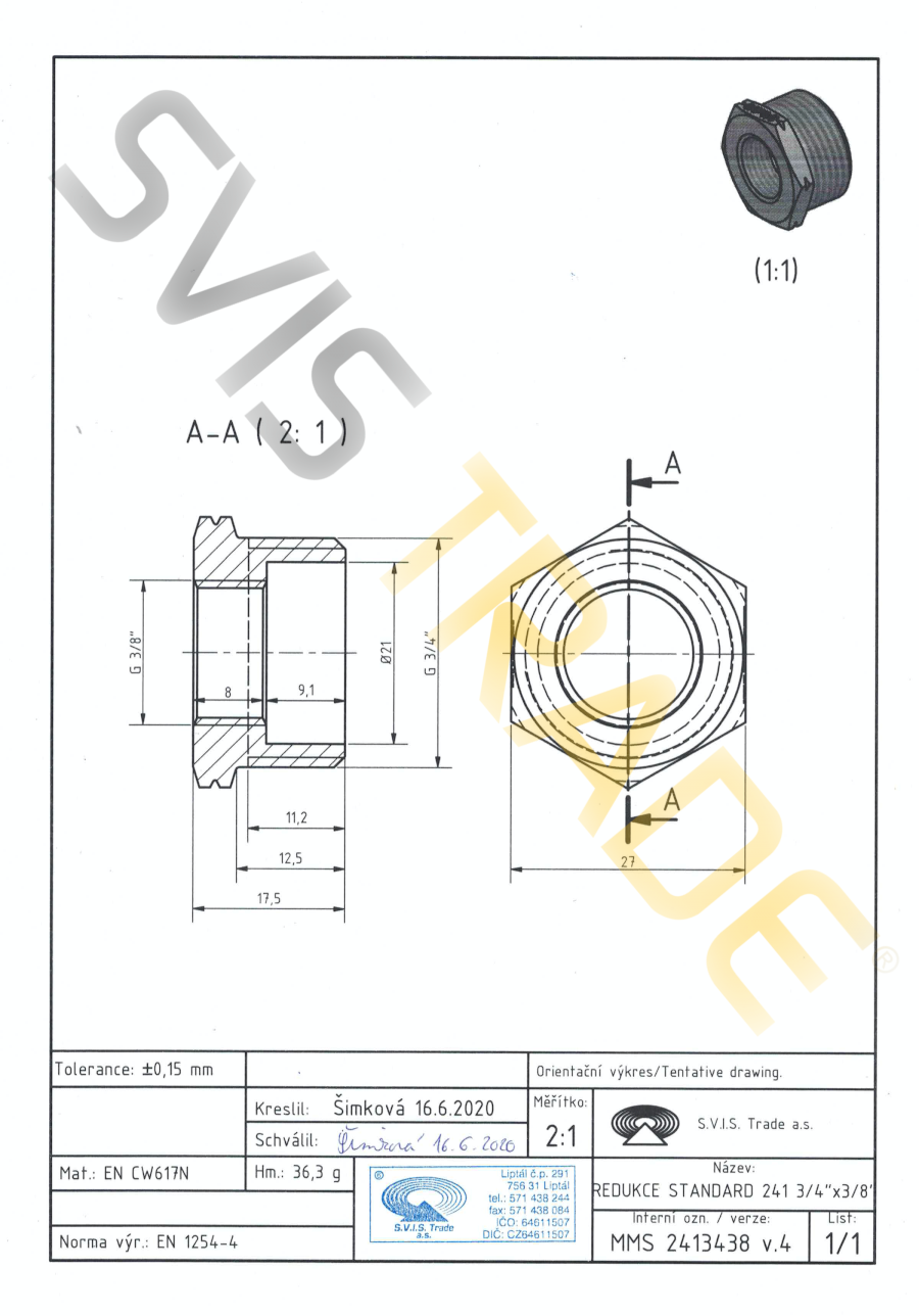Mosiężna redukcja (przejście) MF - 241 MMS-STANDARD. Wyprodukowana według normy EN 1254-4 - gwintowana mosiężna złączka. Bez obróbki powierzchniowej. S.V.I.S Trade-czeski producent kształtek jest posiadaczem certyfikatów ISO 9001,ISO 14001,OHSAS 18001. Na mosiężne kształtki stosujemy ubezpieczenie szkody na całym terytorium EU. Zaprojektowane do dystrybucji wody,wody pitnej,powietrza,nieabrazyjne i nie agresywne media do dopuszczalnego ciśnienia 1,6 MPa i temperatury od -20°C do 120 °C, z koniecznością uniknięcia zamrożenia mediów. Seria kształtek STANDARD-spełnia wyższe wymagania dla połączeń gwintowanych. Mosiężne kształtki są produkowane z mosiądzu CW617 N. Jako materiał uszczelniający do montażu złączek mosiężnych zaleca się uzywanie taśmy teflonowej lub przewodu teflonowego. Producent NIE ZALECA używania konopi jako materiał uszczelniający. Zalecenia dla instalacji: dystrybucja wody,dystrybucja wody pitnej,dystrybucja ciepła,powietrza.