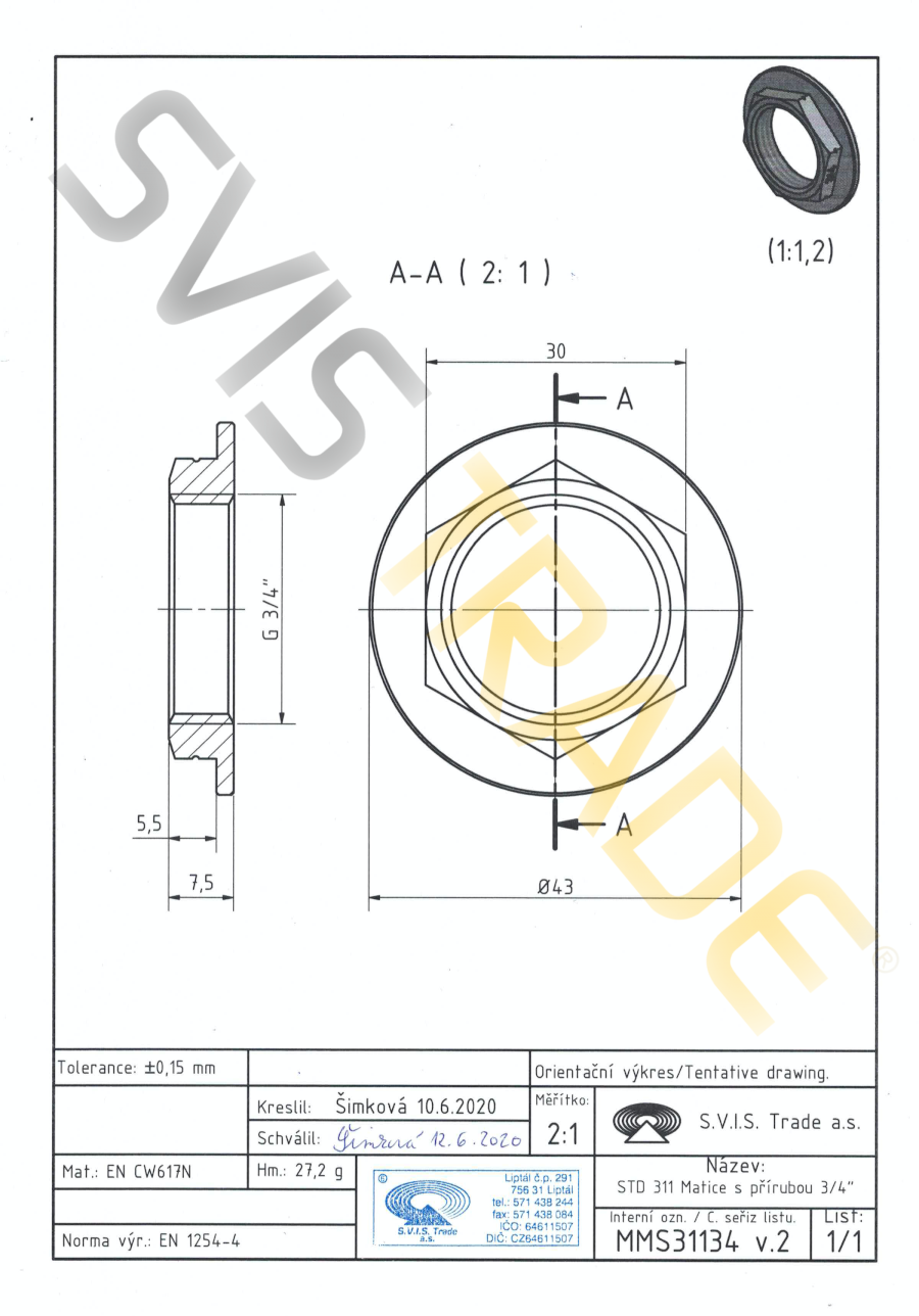 Mosazná matice s přírubou MM – 311 MMS - STANDARD. Vyrobeno dle EN 1254-4 závitová mosazná tvarovka – matice mosazná s přírubou s trubkovým válcovým závitem G vnitřním dle ISO 228-1. Bez povrchové úpravy.