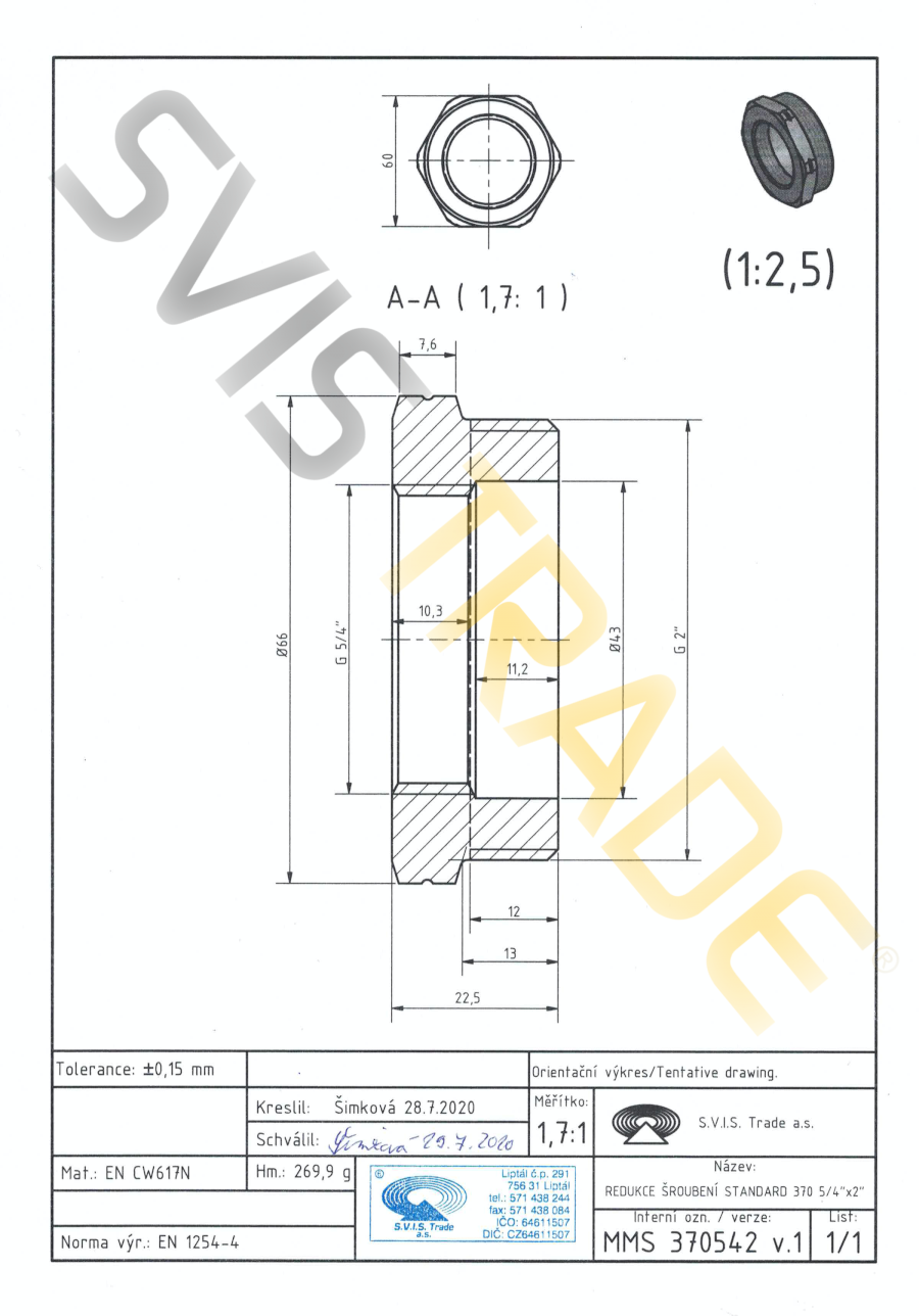 Mosiężna redukcja śrubunka MF - 370 MMS-STANDARD. Wyprodukowana według normy EN 1254-4 - gwintowana mosiężna złączka. Uwaga! Śrubunek powinien być zamontowany jako całość, ponieważ części tych samych śrubunków, ale innych marek mogą nie być wykorzystywane zamiennie! Bez obróbki powierzchniowej. S.V.I.S Trade-czeski producent kształtek jest posiadaczem certyfikatów ISO 9001,ISO 14001,OHSAS 18001. Na mosiężne kształtki stosujemy ubezpieczenie szkody na całym terytorium EU. Zaprojektowane do dystrybucji wody,wody pitnej,powietrza,nieabrazyjne i nie agresywne media do dopuszczalnego ciśnienia 1,6 MPa i temperatury od -20°C do 120 °C, z koniecznością uniknięcia zamrożenia mediów. Seria kształtek STANDARD-spełnia wyższe wymagania dla połączeń gwintowanych. Mosiężne kształtki są produkowane z mosiądzu CW617 N. Jako materiał uszczelniający do montażu złączek mosiężnych zaleca się uzywanie taśmy teflonowej lub przewodu teflonowego. Producent NIE ZALECA używania konopi jako materiał uszczelniający. Zalecenia dla instalacji: dystrybucja wody,dystrybucja wody pitnej,dystrybucja ciepła,powietrza.