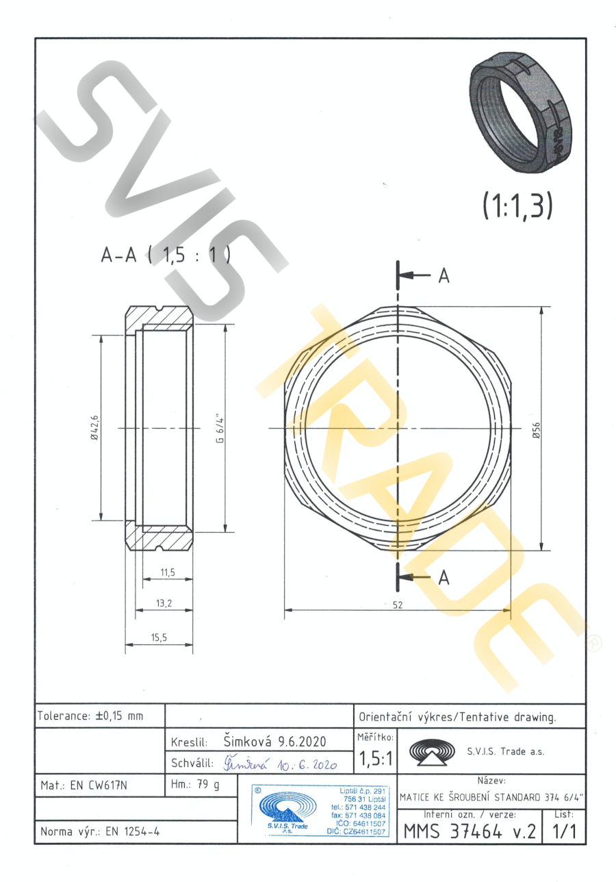 Mosiężna część śrubunka, nakrętka F - 374 MMS-STANDARD. Wyprodukowana według normy EN 1254-4 - gwintowana mosiężna złączka. Uwaga! Śrubunek powinien być zamontowany jako całość, ponieważ części tych samych śrubunków, ale innych marek mogą nie być wykorzystywane zamiennie! Bez obróbki powierzchniowej. S.V.I.S Trade-czeski producent kształtek jest posiadaczem certyfikatów ISO 9001,ISO 14001,OHSAS 18001. Na mosiężne kształtki stosujemy ubezpieczenie szkody na całym terytorium EU. Zaprojektowane do dystrybucji wody,wody pitnej,powietrza,nieabrazyjne i nie agresywne media do dopuszczalnego ciśnienia 1,6 MPa i temperatury od -20°C do 120 °C, z koniecznością uniknięcia zamrożenia mediów. Seria kształtek STANDARD-spełnia wyższe wymagania dla połączeń gwintowanych. Mosiężne kształtki są produkowane z mosiądzu CW617 N. Jako materiał uszczelniający do montażu złączek mosiężnych zaleca się uzywanie taśmy teflonowej lub przewodu teflonowego. Producent NIE ZALECA używania konopi jako materiał uszczelniający. Zalecenia dla instalacji: dystrybucja wody,dystrybucja wody pitnej,dystrybucja ciepła,powietrza.