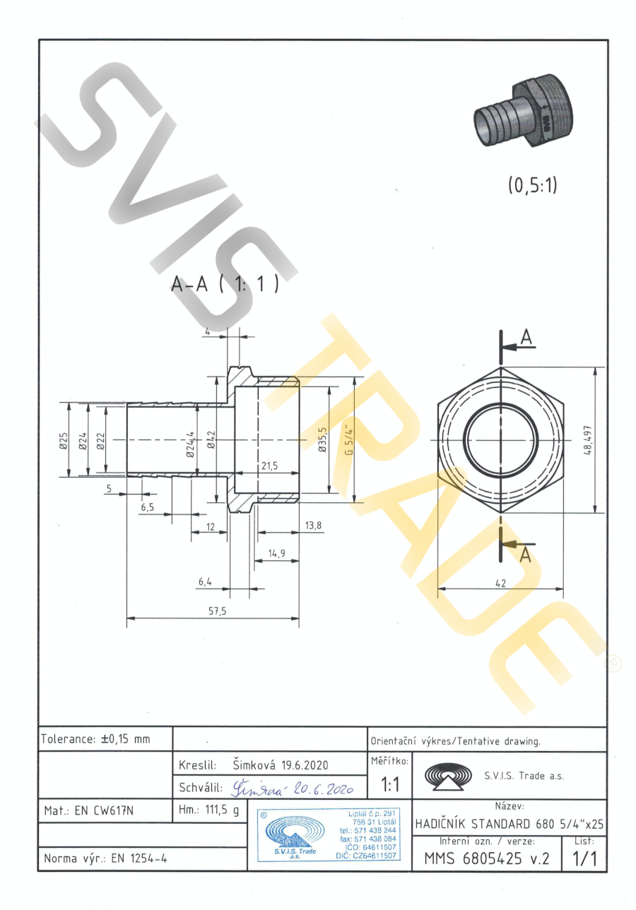 Mosiężna złączka do węża M - 680 MMS-STANDARD. Wyprodukowana według normy EN 1254-4 - gwintowana mosiężna złączka. Bez obróbki powierzchniowej. S.V.I.S Trade-czeski producent kształtek jest posiadaczem certyfikatów ISO 9001,ISO 14001,OHSAS 18001. Na mosiężne kształtki stosujemy ubezpieczenie szkody na całym terytorium EU. Zaprojektowane do dystrybucji wody,wody pitnej,powietrza,nieabrazyjne i nie agresywne media do dopuszczalnego ciśnienia 1,6 MPa i temperatury od -20°C do 120 °C, z koniecznością uniknięcia zamrożenia mediów. Seria kształtek STANDARD-spełnia wyższe wymagania dla połączeń gwintowanych. Mosiężne kształtki są produkowane z mosiądzu CW617 N. Jako materiał uszczelniający do montażu złączek mosiężnych zaleca się uzywanie taśmy teflonowej lub przewodu teflonowego. Producent NIE ZALECA używania konopi jako materiał uszczelniający. Zalecenia dla instalacji: dystrybucja wody,dystrybucja wody pitnej,dystrybucja ciepła,powietrza.