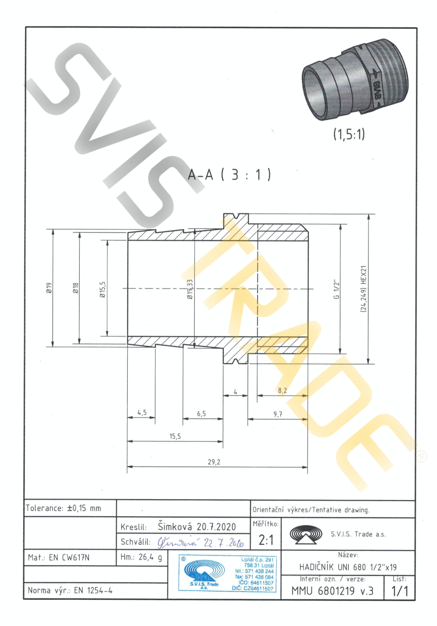 Mosiężna złączka do węża M - 680 MMU-UNIVERSAL. Wyprodukowana według normy EN 1254-4 - gwintowana mosiężna złączka. Bez obróbki powierzchniowej. S.V.I.S Trade-czeski producent kształtek jest posiadaczem certyfikatów ISO 9001,ISO 14001,OHSAS 18001. Na mosiężne kształtki stosujemy ubezpieczenie szkody na całym terytorium EU. Zaprojektowane do dystrybucji wody,wody pitnej,powietrza,nieabrazyjne i nie agresywne media do dopuszczalnego ciśnienia 1,6 MPa i temperatury od -20°C do 120 °C, z koniecznością uniknięcia zamrożenia mediów. Seria kształtek UNIVESRAL - spełniają standardowe wymagania dotyczące połączeń gwintowych. Mosiężne kształtki są produkowane z mosiądzu CW617 N. Jako materiał uszczelniający do montażu złączek mosiężnych zaleca się uzywanie taśmy teflonowej lub przewodu teflonowego. Producent NIE ZALECA używania konopi jako materiał uszczelniający. Zalecenia dla instalacji: dystrybucja wody,dystrybucja wody pitnej,dystrybucja ciepła,powietrza.