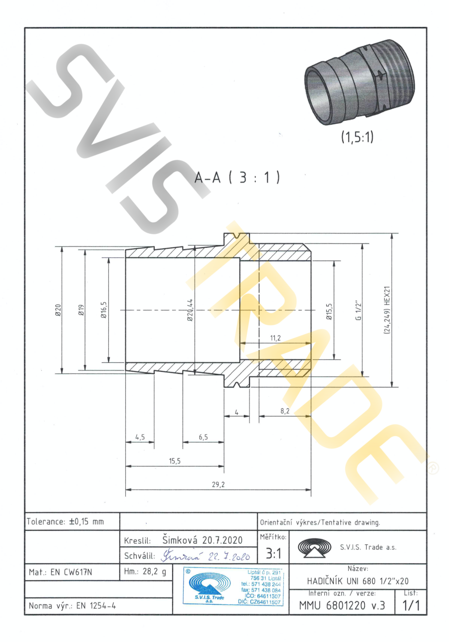 Mosiężna złączka do węża M - 680 MMU-UNIVERSAL. Wyprodukowana według normy EN 1254-4 - gwintowana mosiężna złączka. Bez obróbki powierzchniowej. S.V.I.S Trade-czeski producent kształtek jest posiadaczem certyfikatów ISO 9001,ISO 14001,OHSAS 18001. Na mosiężne kształtki stosujemy ubezpieczenie szkody na całym terytorium EU. Zaprojektowane do dystrybucji wody,wody pitnej,powietrza,nieabrazyjne i nie agresywne media do dopuszczalnego ciśnienia 1,6 MPa i temperatury od -20°C do 120 °C, z koniecznością uniknięcia zamrożenia mediów. Seria kształtek UNIVESRAL - spełniają standardowe wymagania dotyczące połączeń gwintowych. Mosiężne kształtki są produkowane z mosiądzu CW617 N. Jako materiał uszczelniający do montażu złączek mosiężnych zaleca się uzywanie taśmy teflonowej lub przewodu teflonowego. Producent NIE ZALECA używania konopi jako materiał uszczelniający. Zalecenia dla instalacji: dystrybucja wody,dystrybucja wody pitnej,dystrybucja ciepła,powietrza.