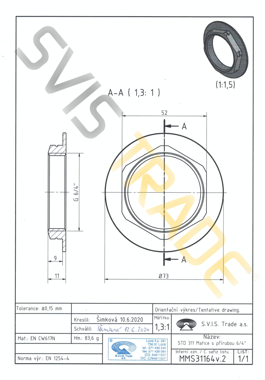 S.V.I.S. Trade a.s. - český výrobce fitinek je držitelem certifikátů ISO 9001, ISO 14001, OHSAS 18001. Na mosazné fitinky se vztahuje pojištění za škody pro území celé EU.