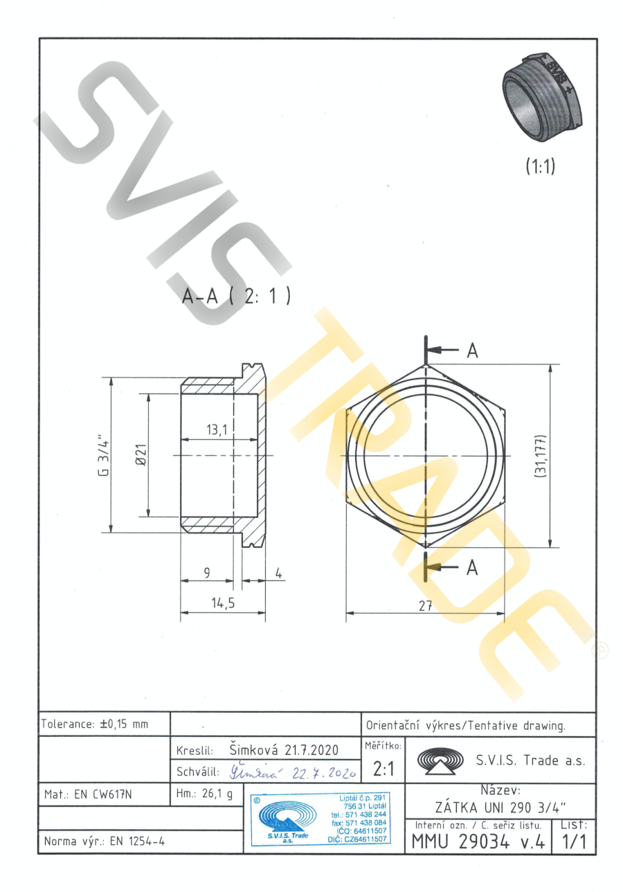 Filetul fitingurilor din alama,tip-dop cu hexagon,cu filetele tevii exterioare,fara tratament de suprafata.Conectarea filetelor G,sunt paralele pentru unirea(imbinarea) nu etansarea pe filete in conformitate cu ISO 228-1.Produse in conformitate cu EN 1254-4.