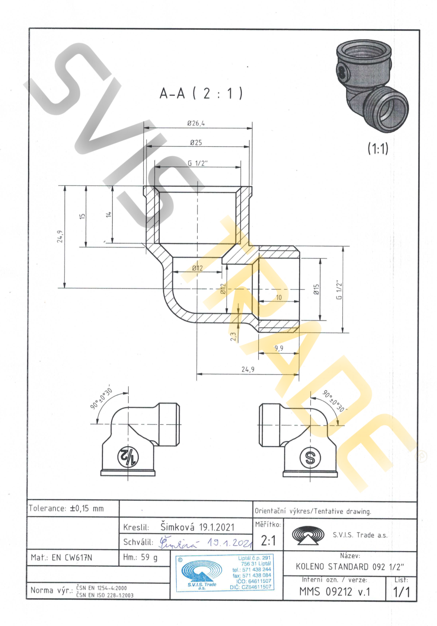 Závitová tvarovka z mosadze, druh - koleno 90 ° s rúrkovými závitmi vnútorné x vonkajšie, bez povrchovej úpravy. Pripojovacie závity G sú valcové pre spoje netesniace na závitoch podľa normy ISO 228-1. Vyrobené podľa normy EN 1254-4.