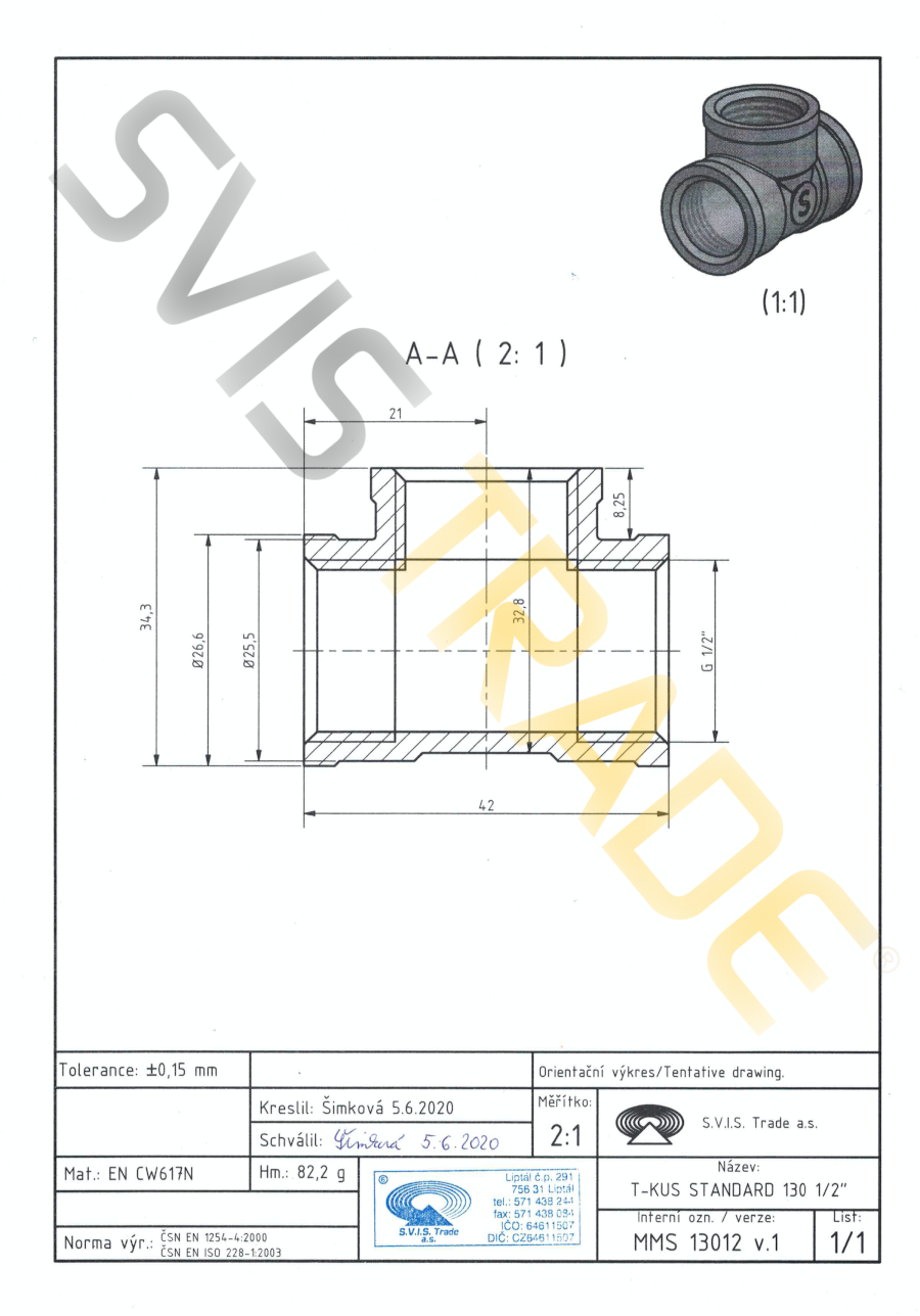 Závitová tvarovka z mosadze, druh - T-kus jednoznačný s rúrkovými závitmi vnútorný x vnútorný x vnútorné, bez povrchovej úpravy. Pripojovacie závity G sú valcové pre spoje netesniace na závitoch podľa normy ISO 228-1. Vyrobené podľa normy EN 1254-4.