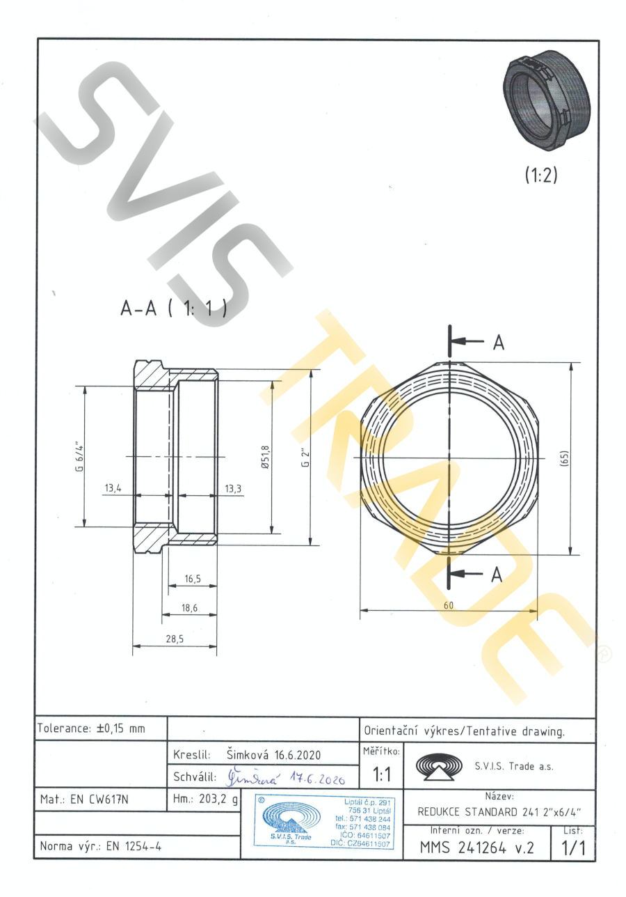Závitová tvarovka z mosadze, druh - redukcia (prechod) s rúrkovými závitmi vnútorné x vonkajšie, bez povrchovej úpravy. Závity sú valcové pre spoje netesniace na závitoch podľa normy ISO 228-1. Vyrobené podľa normy EN 1254-4.