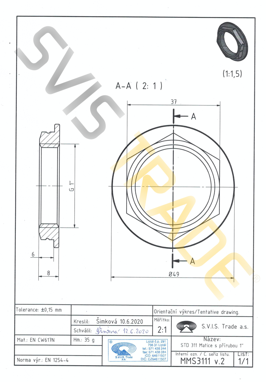 Mosazná matice s přírubou MM – 311 MMS - STANDARD. Vyrobeno dle EN 1254-4 závitová mosazná tvarovka – matice mosazná s přírubou s trubkovým válcovým závitem G vnitřním dle ISO 228-1. Bez povrchové úpravy.