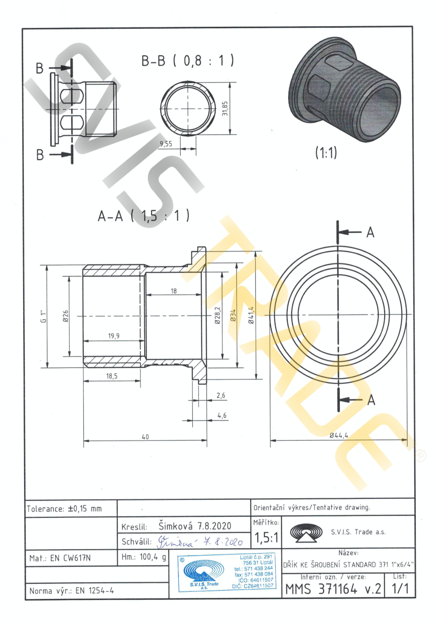 Závitová tvarovka z mosadze, druh - diel šróbenie, nátrubok oporný s rúrkovým pripojovacím závitom vonkajším, bez povrchovej úpravy. Pripojovacie závity G sú valcové pre spoje netesniace na závitoch podľa normy ISO 228-1. Vyrobené podľa normy EN 1254-4. Upozornenie: Šróbenie by malo byť použité len ako zmontovaný celok, pretože jednotlivé diely šróbenie rôznych výrobných značiek alebo jednotlivé diely rôznych typov a rovnakých výrobných značiek nemusí byť zameniteľné! Použitie: Určené pre použitie v potrubných rozvodoch vody (vrátane vody určenej pre ľudskú spotrebu), vzduchu a ďalších neabrazívnych a neagresívnych médií s najvyšším pracovným pretlakom 1,6 MPa pri teplote media od 0 ° C do + 120 ° C.
