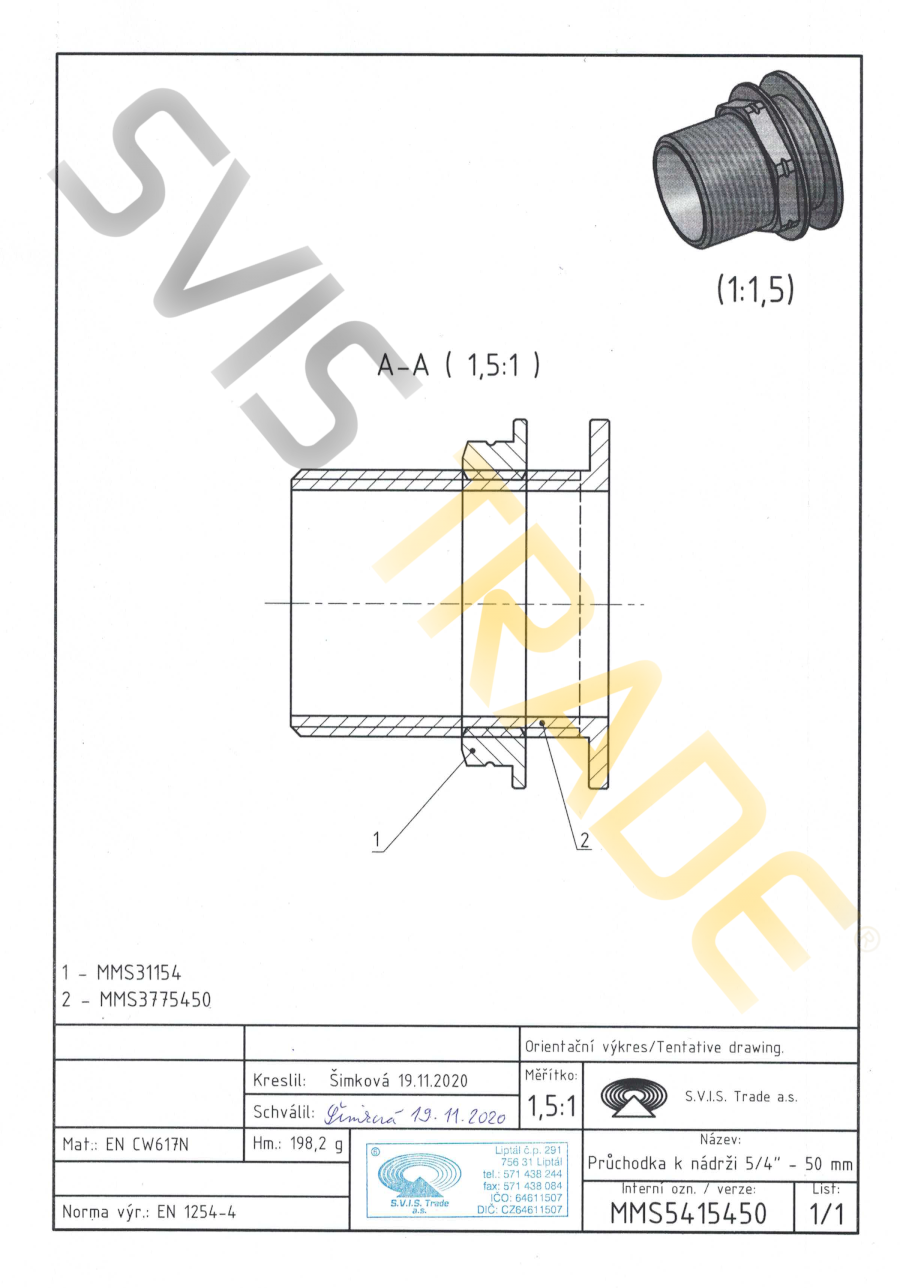 Mosazná průchodka k nádrži M – 541 MMS - STANDARD. Vyrobeno dle EN 1254-4 závitová mosazná tvarovka – mosazná průchodka k nádrži s trubkovým válcovým závitem G vnější dle ISO 228-1. Bez povrchové úpravy.