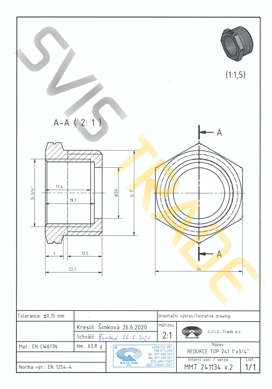 Závitová tvarovka z mosadze, druh - redukcia (prechod) s rúrkovými závitmi vnútorné x vonkajšie, bez povrchovej úpravy. Závity sú valcové pre spoje netesniace na závitoch podľa normy ISO 228-1. Vyrobené podľa normy EN 1254-4.