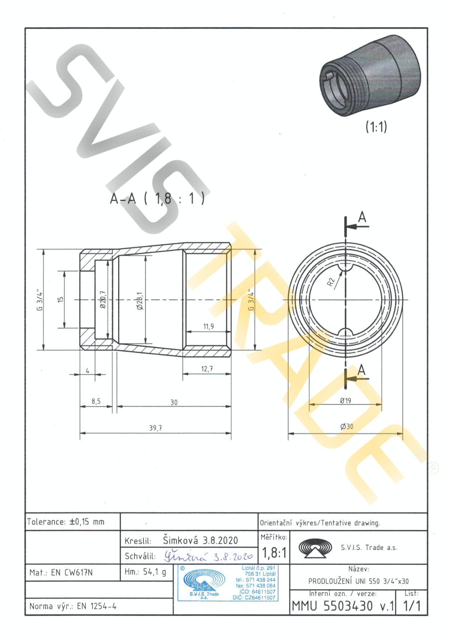 Tvarovka z mosadze CW617N. Určená pre spájanie so závitom ISO 228-1. Prevedenie: bez povrchovej úpravy.