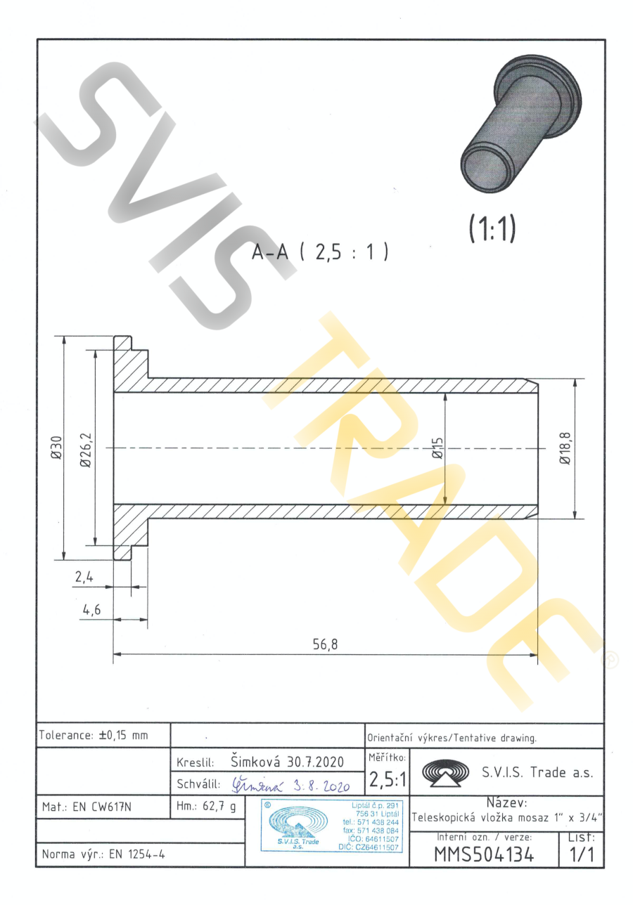 Tvarovka z mosazi, druh – díl teleskopického šroubení, redukovaná vysunovací vložka s osazením, bez závitu. Bez povrchové úpravy. Připojovací závity G jsou válcové pro spoje netěsnící na závitech podle normy ISO 228-1. Vyrobeno podle normy EN 1254-4.