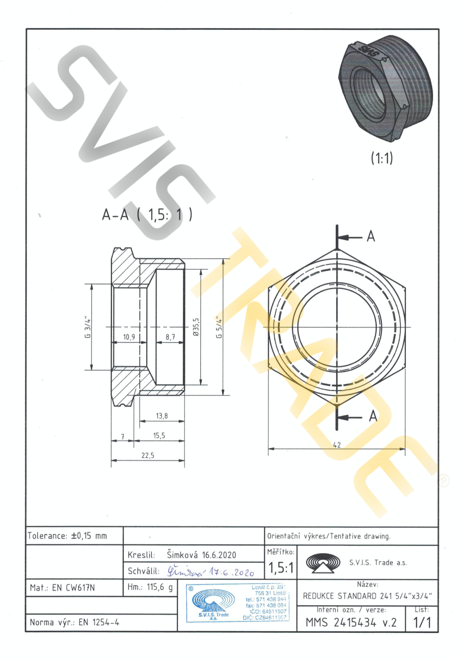 Navojni mesingani fiting, tip – Redukcija sa cijevnim navojima unutarnji-vanjski, bez površinske obrade. Spojni navoj G paralelan je spajanju, ne brtvljenju, na navoje sukladno ISO 288-1. Proizvedeno prema normi EN 1254-4.