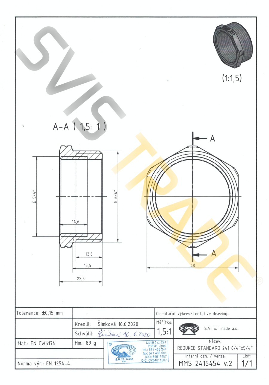 Navojni mesingani fiting, tip – Redukcija sa cijevnim navojima unutarnji-vanjski, bez površinske obrade. Spojni navoj G paralelan je spajanju, ne brtvljenju, na navoje sukladno ISO 288-1. Proizvedeno prema normi EN 1254-4.