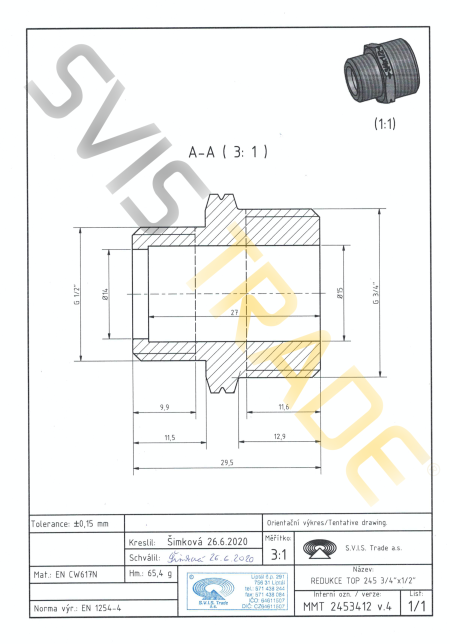 Navojni mesingani fiting, tip – Nipl reducirani sa cijevnim navojima vanjski-vanjski, bez površinske obrade. Spojni navoj G paralelan je spajanju, ne brtvljenju, na navoje sukladno ISO 288-1. Proizvedeno prema normi EN 1254-4.