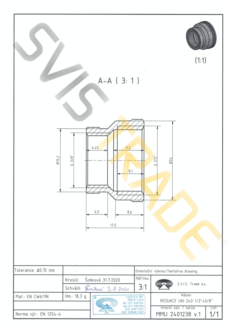 Navojni mesingani fiting, tip – Kolčak reducirani sa cijevnim navojima unutarnji-unutarnji, bez površinske obrade. Spojni navoj G paralelan je spajanju, ne brtvljenju, na navoje sukladno ISO 288-1. Proizvedeno prema normi EN 1254-4.