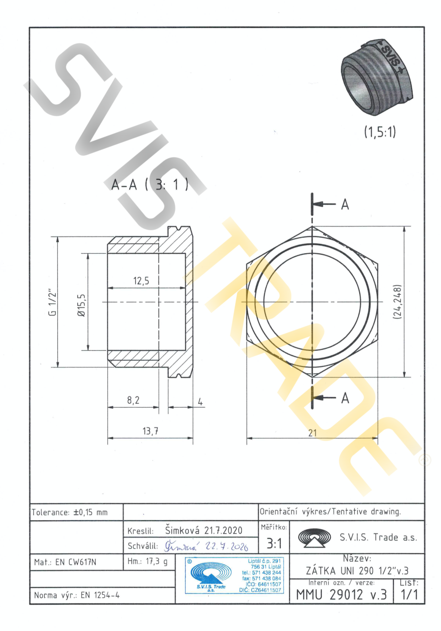 Navojni mesingani fiting, tip – Čep sa heksagonom sa cijevnim navojima vanjski, bez površinske obrade. Spojni navoj G paralelan je spajanju, ne brtvljenju, na navoje sukladno ISO 288-1. Proizvedeno prema normi EN 1254-4.