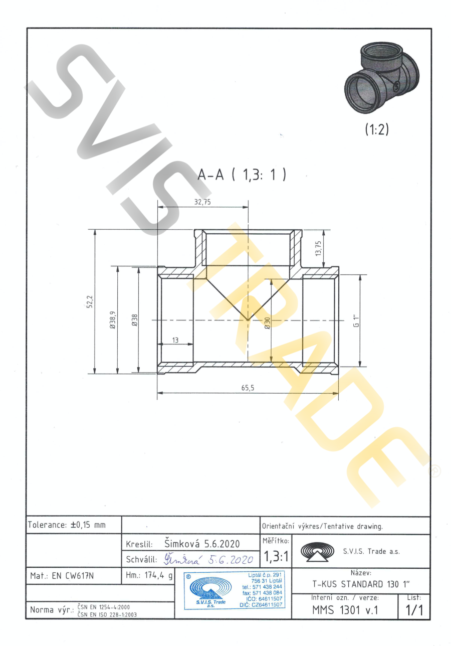 Menetes sárgaréz idom, T-idom belső-belső-belső csőmenettel, felületi kezelés nélkül. Hengeres G menettel, ahol a tömítés nem a menetben van - ISO 228-1 norma szerint. Gyártása az EN 1254-4 szerint történik. S.V.I.S. Trade Kft. - menetes idomok Csehországi gyártója , az ISO 9001, ISO 14001, OHSAS 18001 tanúsítványok tulajdonosa. A sárgaréz idomok meghibásodása okozta károkra, biztosítás van érvényben az egész EU területén. A fittingek felhasználhatóak levegő, víz, ivóvíz , nem abrazív és nem agresszív anyagokat tartalmazó rendszerekhez, 1,6MP nyomás értékig és -20°C tól 120°C feltételek mellett , miközben biztosított az anyagok fagyállósága. A STANDARD minőségben előállitott fittingek magasabb követelményeknek felelnek meg a menetek szempontjából. A sárgaréz idomok a CW617N minőségi réz anyagból vannak előállitva. A gyártó a fittingek tömítéséhez tefloncsík illetve teflon tömítőzsinór használatát javasolja. A gyártó NEM AJÁNLJA a kenderből készült tömítések használatát sárgaréz fittingjeihez. A gyártó ajánlata felhasználáshoz, szereléshez: víz és ivóvíz rendszerekhez, központi fűtéshez, levegő fűtéses rendszerekhez.