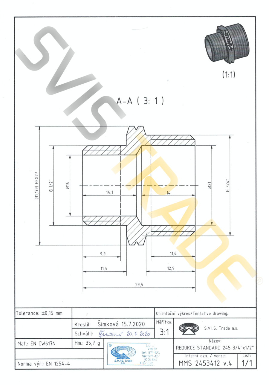 Menetes sárgaréz idom, szűkített közcsavar külső-külső csőmenettel, felületi kezelés nélkül. Hengeres G menettel, ahol a tömítés nem a menetben van - ISO 228-1 norma szerint. Gyártása az EN 1254-4 szerint történik. S.V.I.S. Trade Kft. - menetes idomok Csehországi gyártója , az ISO 9001, ISO 14001, OHSAS 18001 tanúsítványok tulajdonosa. A sárgaréz idomok meghibásodása okozta károkra, biztosítás van érvényben az egész EU területén. A fittingek felhasználhatóak levegő, víz, ivóvíz , nem abrazív és nem agresszív anyagokat tartalmazó rendszerekhez, 1,6MP nyomás értékig és -20°C tól 120°C feltételek mellett , miközben biztosított az anyagok fagyállósága. A STANDARD minőségben előállitott fittingek magasabb követelményeknek felelnek meg a menetek szempontjából. A sárgaréz idomok a CW617N minőségi réz anyagból vannak előállitva. A gyártó a fittingek tömítéséhez tefloncsík illetve teflon tömítőzsinór használatát javasolja. A gyártó NEM AJÁNLJA a kenderből készült tömítések használatát sárgaréz fittingjeihez. A gyártó ajánlata felhasználáshoz, szereléshez: víz és ivóvíz rendszerekhez, központi fűtéshez, levegő fűtéses rendszerekhez.