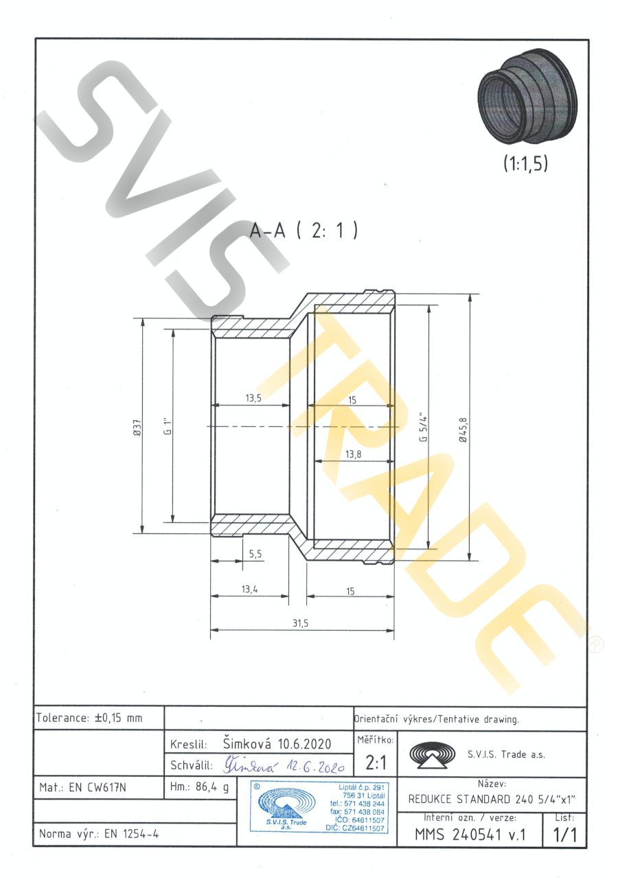 Mosiężna mufa z przejściem redukcyjnym FF - 240 MMS-STANDARD. Wyprodukowana według normy EN 1254-4 - gwintowana mosiężna złączka. Bez obróbki powierzchniowej. S.V.I.S Trade-czeski producent kształtek jest posiadaczem certyfikatów ISO 9001,ISO 14001,OHSAS 18001. Na mosiężne kształtki stosujemy ubezpieczenie szkody na całym terytorium EU. Zaprojektowane do dystrybucji wody,wody pitnej,powietrza,nieabrazyjne i nie agresywne media do dopuszczalnego ciśnienia 1,6 MPa i temperatury od -20°C do 120 °C, z koniecznością uniknięcia zamrożenia mediów. Seria kształtek STANDARD-spełnia wyższe wymagania dla połączeń gwintowanych. Mosiężne kształtki są produkowane z mosiądzu CW617 N. Jako materiał uszczelniający do montażu złączek mosiężnych zaleca się uzywanie taśmy teflonowej lub przewodu teflonowego. Producent NIE ZALECA używania konopi jako materiał uszczelniający. Zalecenia dla instalacji: dystrybucja wody,dystrybucja wody pitnej,dystrybucja ciepła,powietrza.