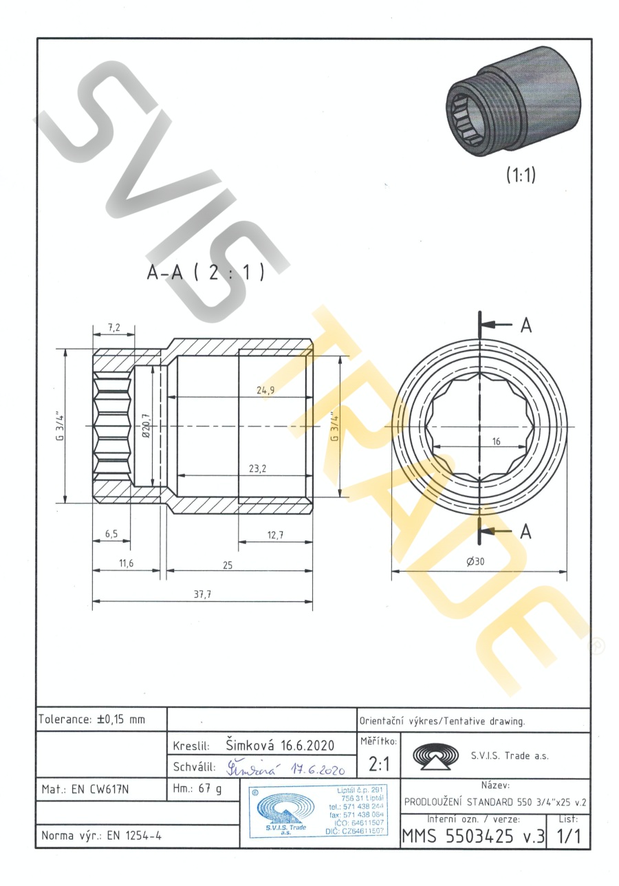 Mosiężna przedłużka MF - 550 MMS-STANDARD. Wyprodukowana według normy EN 1254-4 - gwintowana mosiężna złączka. Bez obróbki powierzchniowej. S.V.I.S Trade-czeski producent kształtek jest posiadaczem certyfikatów ISO 9001,ISO 14001,OHSAS 18001. Na mosiężne kształtki stosujemy ubezpieczenie szkody na całym terytorium EU. Zaprojektowane do dystrybucji wody,wody pitnej,powietrza,nieabrazyjne i nie agresywne media do dopuszczalnego ciśnienia 1,6 MPa i temperatury od -20°C do 120 °C, z koniecznością uniknięcia zamrożenia mediów. Seria kształtek STANDARD-spełnia wyższe wymagania dla połączeń gwintowanych. Mosiężne kształtki są produkowane z mosiądzu CW617 N. Jako materiał uszczelniający do montażu złączek mosiężnych zaleca się uzywanie taśmy teflonowej lub przewodu teflonowego. Producent NIE ZALECA używania konopi jako materiał uszczelniający. Zalecenia dla instalacji: dystrybucja wody,dystrybucja wody pitnej,dystrybucja ciepła,powietrza.