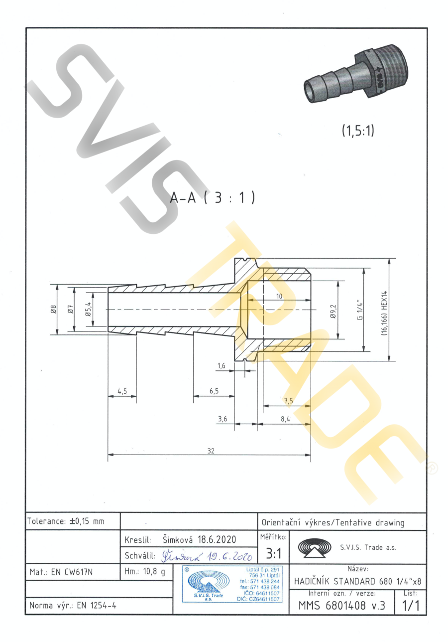 Mosiężna złączka do węża M - 680 MMS-STANDARD. Wyprodukowana według normy EN 1254-4 - gwintowana mosiężna złączka. Bez obróbki powierzchniowej. S.V.I.S Trade-czeski producent kształtek jest posiadaczem certyfikatów ISO 9001,ISO 14001,OHSAS 18001. Na mosiężne kształtki stosujemy ubezpieczenie szkody na całym terytorium EU. Zaprojektowane do dystrybucji wody,wody pitnej,powietrza,nieabrazyjne i nie agresywne media do dopuszczalnego ciśnienia 1,6 MPa i temperatury od -20°C do 120 °C, z koniecznością uniknięcia zamrożenia mediów. Seria kształtek STANDARD-spełnia wyższe wymagania dla połączeń gwintowanych. Mosiężne kształtki są produkowane z mosiądzu CW617 N. Jako materiał uszczelniający do montażu złączek mosiężnych zaleca się uzywanie taśmy teflonowej lub przewodu teflonowego. Producent NIE ZALECA używania konopi jako materiał uszczelniający. Zalecenia dla instalacji: dystrybucja wody,dystrybucja wody pitnej,dystrybucja ciepła,powietrza.