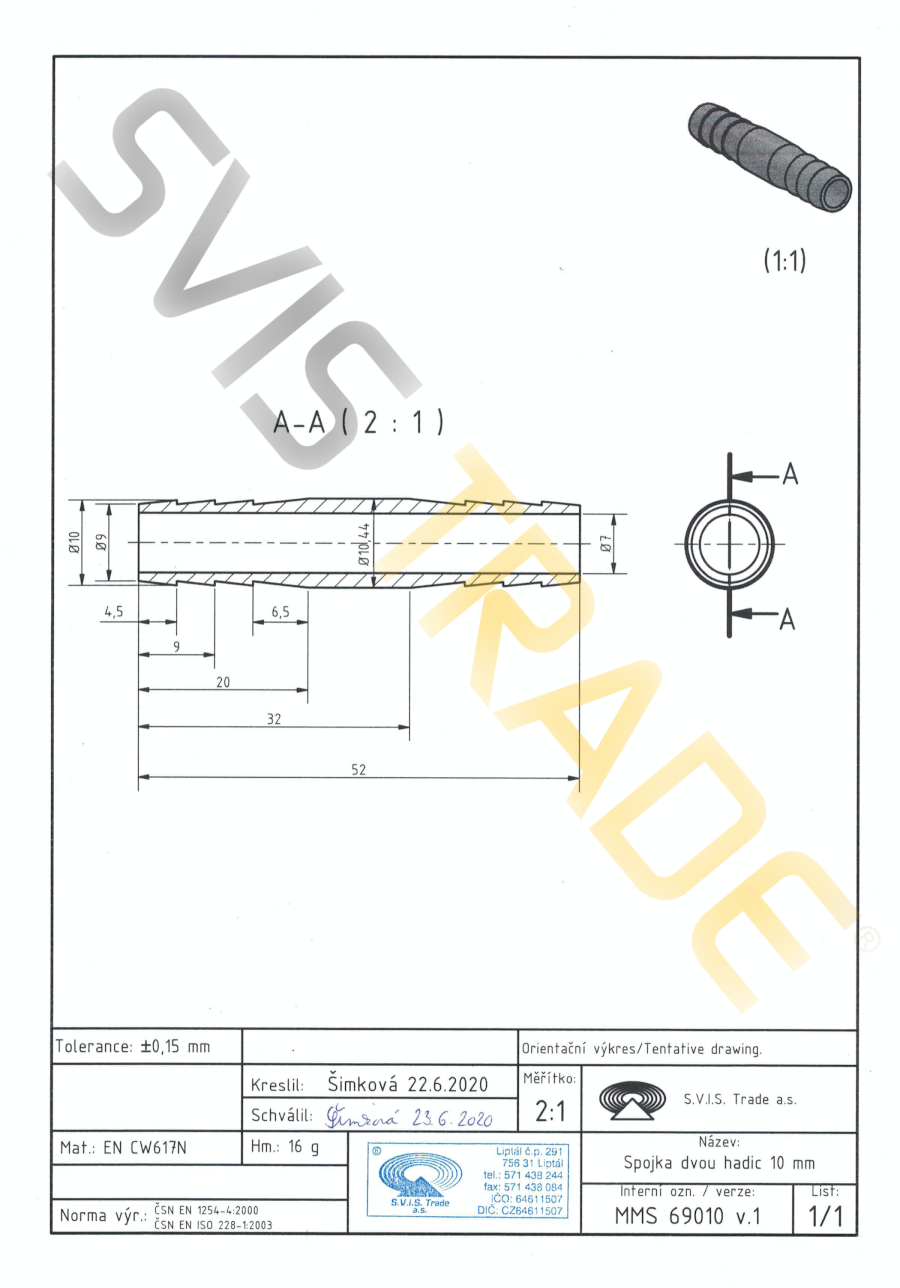 Mosiężne podwójne złącze do węża - 690 MMS-STANDARD. Wyprodukowana według normy EN 1254-4 - gwintowana mosiężna złączka. Bez obróbki powierzchniowej. S.V.I.S Trade-czeski producent kształtek jest posiadaczem certyfikatów ISO 9001,ISO 14001,OHSAS 18001. Na mosiężne kształtki stosujemy ubezpieczenie szkody na całym terytorium EU. Zaprojektowane do dystrybucji wody,wody pitnej,powietrza,nieabrazyjne i nie agresywne media do dopuszczalnego ciśnienia 1,6 MPa i temperatury od -20°C do 120 °C, z koniecznością uniknięcia zamrożenia mediów. Seria kształtek STANDARD-spełnia wyższe wymagania dla połączeń gwintowanych. Mosiężne kształtki są produkowane z mosiądzu CW617 N. Jako materiał uszczelniający do montażu złączek mosiężnych zaleca się uzywanie taśmy teflonowej lub przewodu teflonowego. Producent NIE ZALECA używania konopi jako materiał uszczelniający. Zalecenia dla instalacji: dystrybucja wody,dystrybucja wody pitnej,dystrybucja ciepła,powietrza.